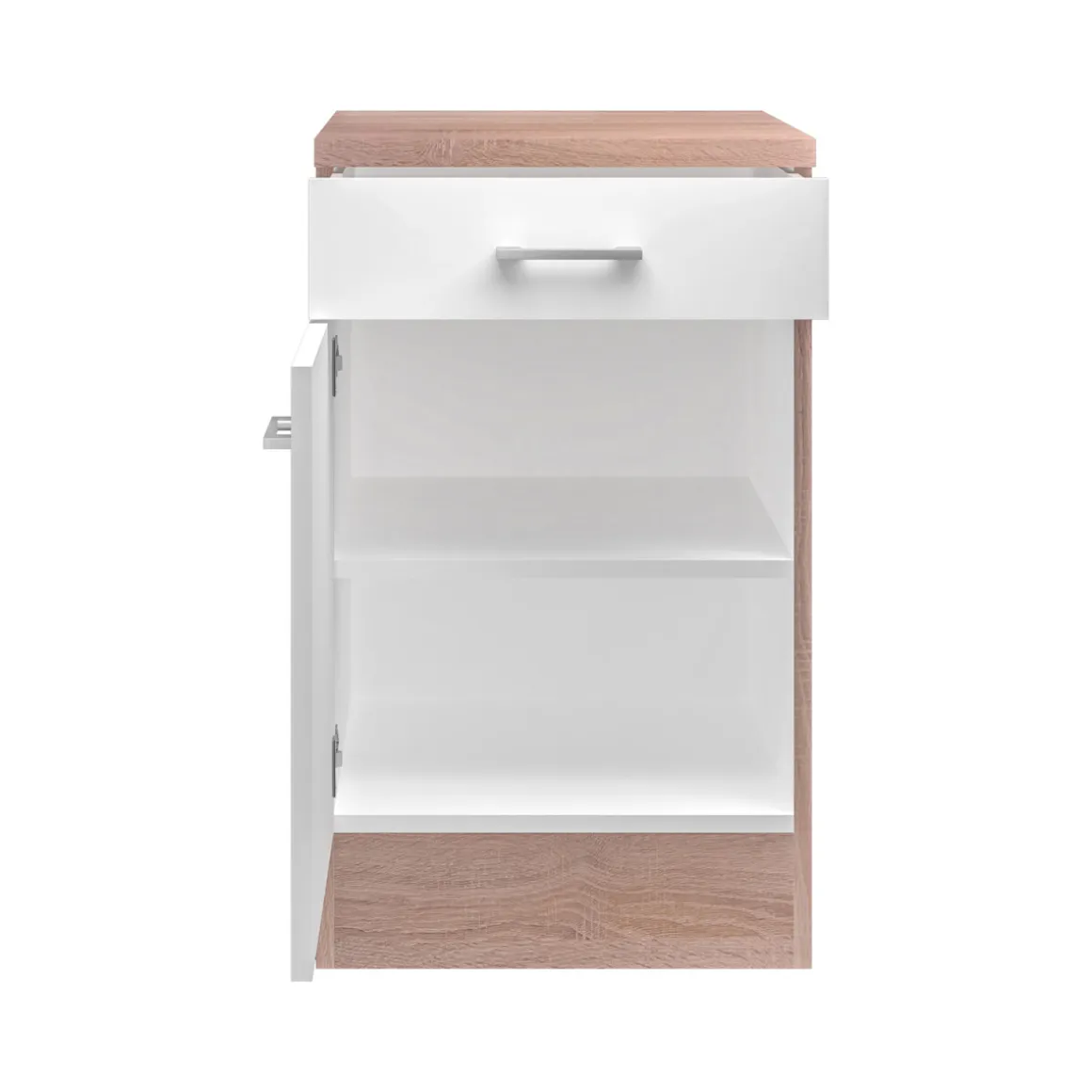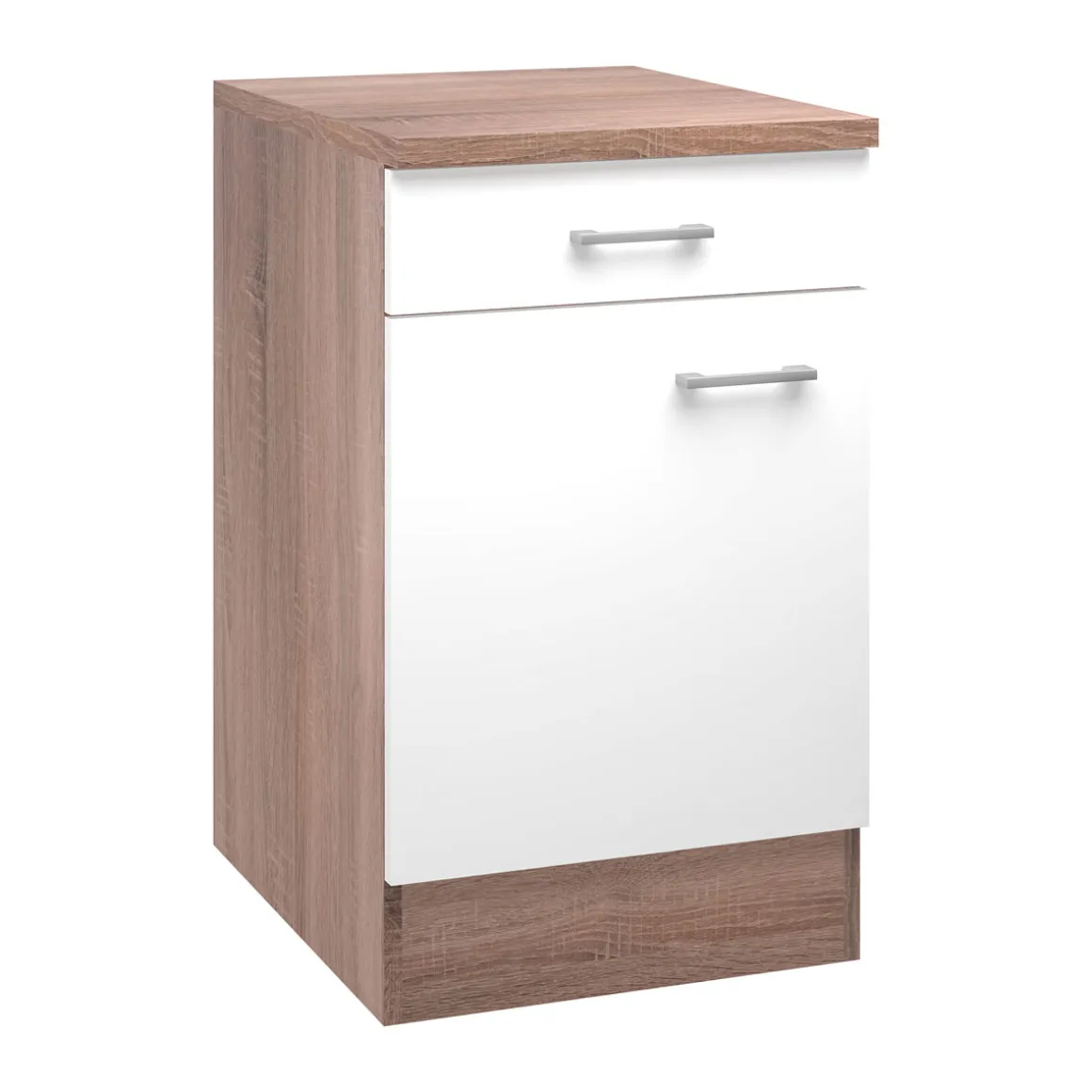Verleihen Sie Ihrer Küche einen modernen Touch mit dem Flex-Well Küchenunterschrank Samoa! Mit seiner eleganten Kombination aus weißer Front und Sonoma Eiche Nachbildung bringt er eine angenehme Wärme in Ihren Raum. Die matte Oberfläche sorgt für ein zeitloses Design, das sich perfekt in jede Kücheneinrichtung einfügt. Ob als zusätzlicher Stauraum oder als stilvolles Highlight – dieser Unterschrank erfüllt all Ihre Wünsche. Sein durchdachtes Innenleben mit einer Drehtür, einem Schubkasten und einem Einlegeboden bietet Platz für alles, was Sie griffbereit haben möchten.