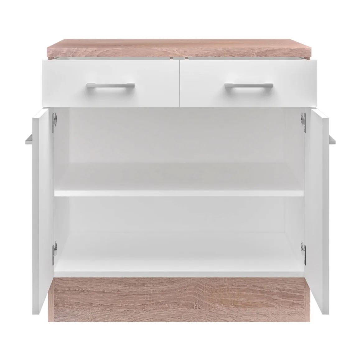 - Bügelgriff aus Aluminium unterstreicht das zeitgemäße Design des Unterschranks perfekt