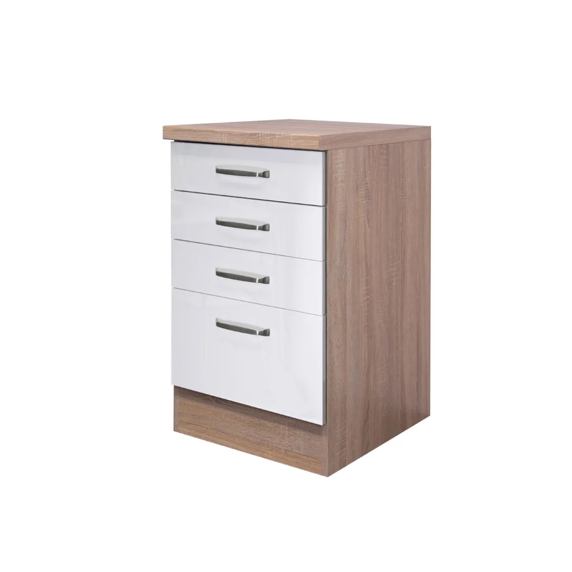 Verleihen Sie Ihrer Küche das gewisse Etwas! Der Flex-Well Küchenunterschrank Valero in Weiß und Sonoma Eiche ist nicht nur ein praktisches Möbelstück, sondern auch ein echter Hingucker. Mit seiner hochglänzenden Front in strahlendem Weiß und der natürlichen Optik des Korpus in Sonoma Eichefarben bringt er Eleganz und Wärme zugleich in Ihren Raum. Die drei geräumigen Schubladen sowie der großzügige Auszug bieten ausreichend Platz für all Ihre Küchenutensilien. Ob Besteck, Kochgeschirr oder Vorräte – hier findet alles seinen Platz! Dank der melaminbeschichteten Oberfläche ist der Unterschrank besonders pflegeleicht und langlebig, sodass Sie lange Freude daran haben werden.