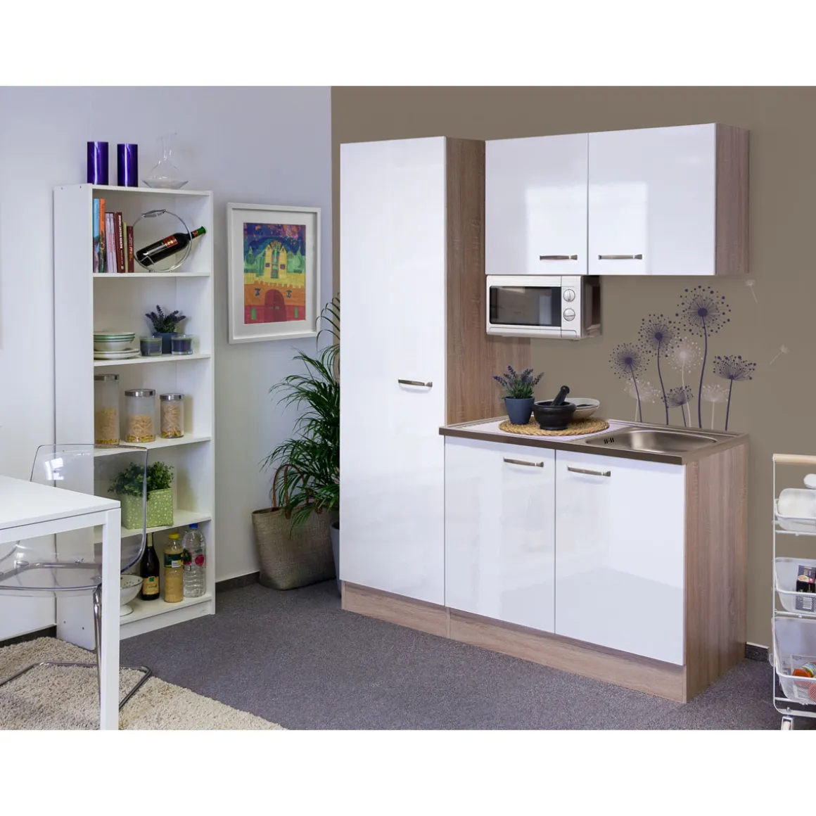 Die Flex-Well Singleküche VALERO 1005-000 ist der ideale Begleiter für alle, die auf kleinem Raum großen Komfort suchen. Mit ihrem modernen Design in Weiß Hochglanz und Sonoma Eiche Nachbildung schafft sie eine stilvolle Atmosphäre, die Ihre Küche zum Blickfang macht. Die integrierte Mikrowelle mit einer Leistung von 700 W bietet Ihnen schnellen Genuss und ist perfekt für den hektischen Alltag geeignet. Diese kompakte Miniküche vereint Funktionalität und Stil – ein echtes Must-have für jeden Haushalt!
