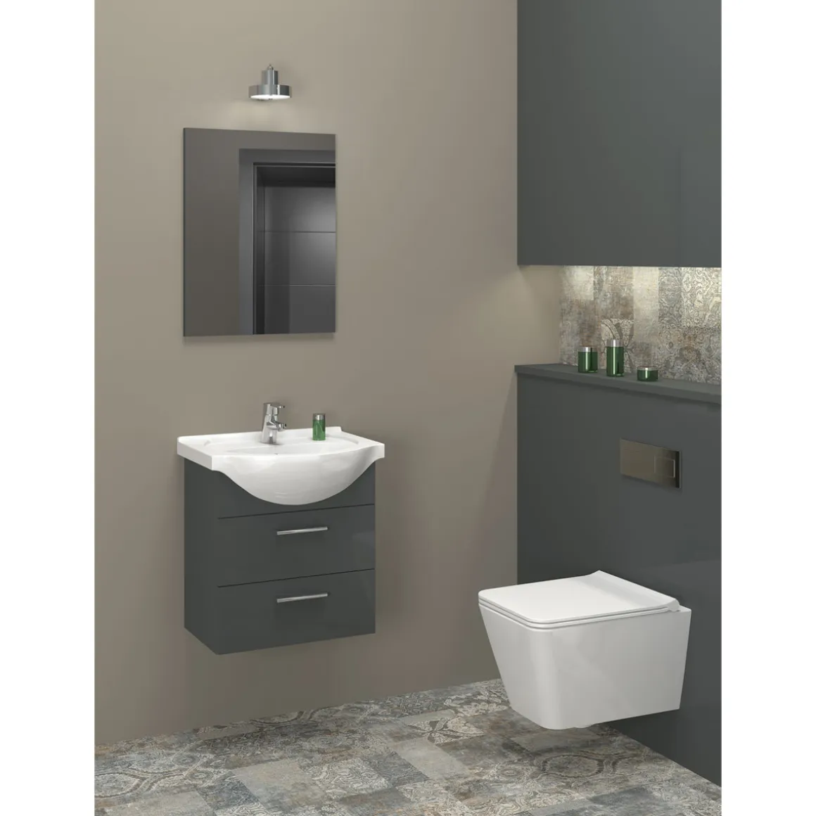 - Harmonische Kombination aus anthrazitfarbener Front mit Wotan Eiche sorgt für moderne Eleganz im Badezimmer