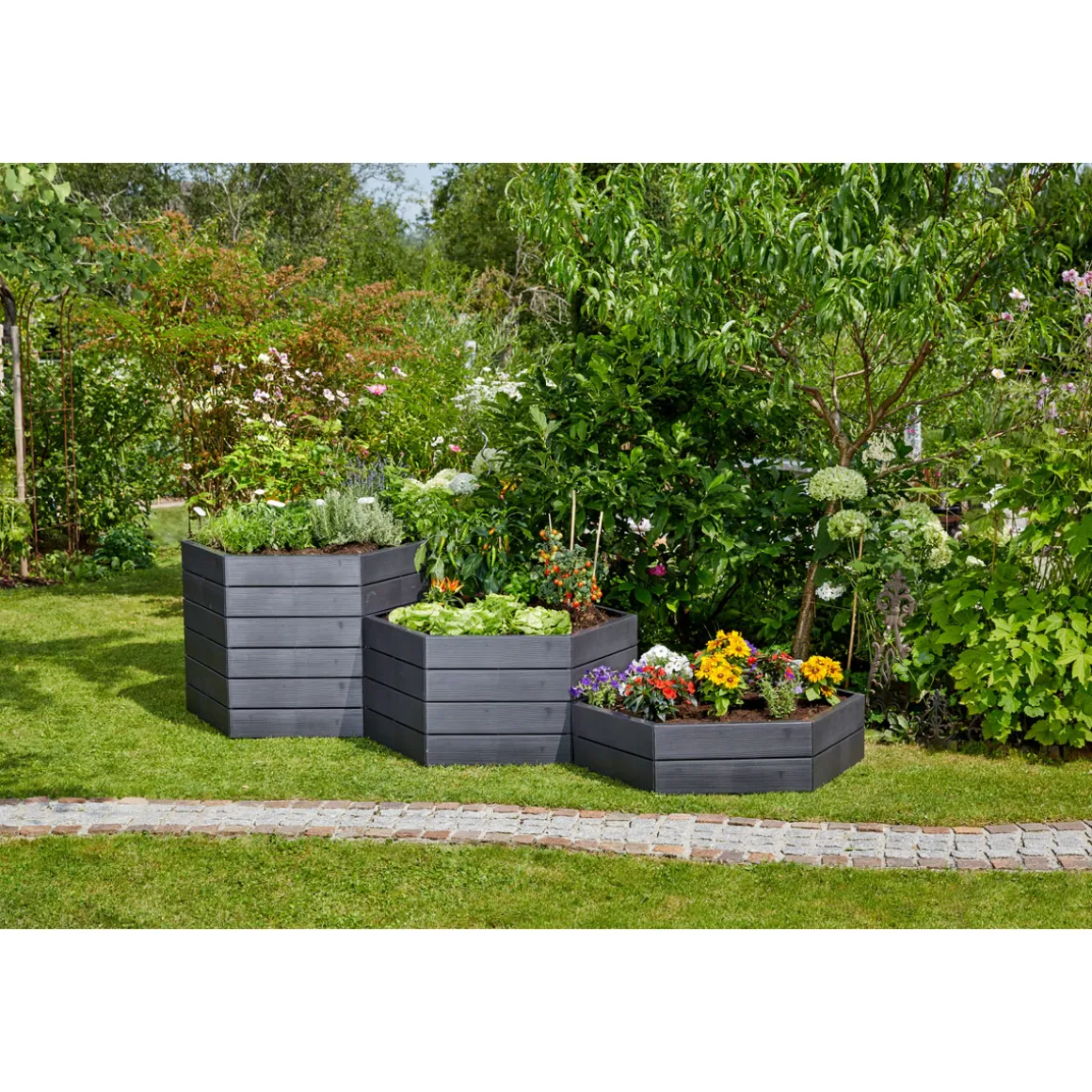 Mit dem Garantia Hochbeet Ergo Vario 1 Wood inkl. FLORA wird die Gartenarbeit zum Vergnügen. Das sechseckige Hochbeet mit Holzoptik ist nicht nur ein optisches Highlight, sondern auch äußerst flexibel und nachhaltig.