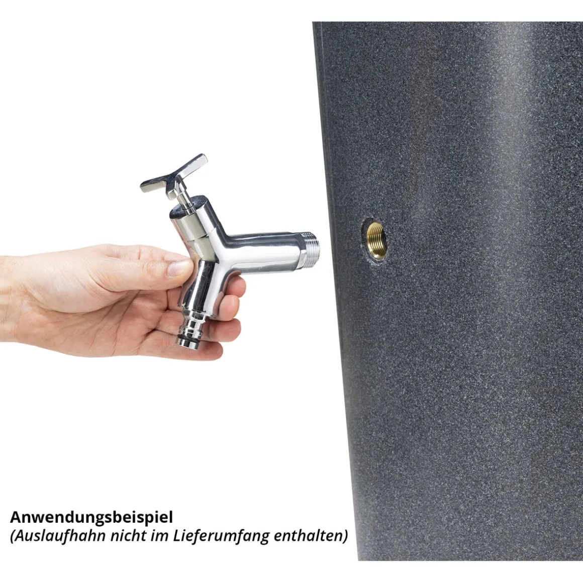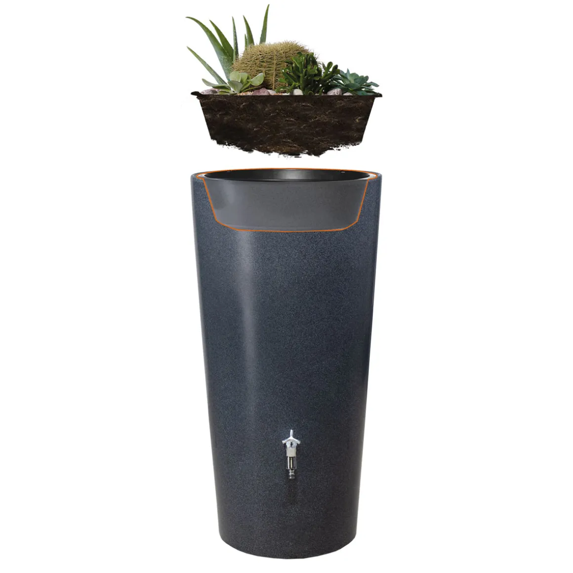 Regentonne Stone 2in1 lava – Modernes Design in hochwertiger Natursteinoptik. Der Behälter überzeugt durch seine hochwertige, glänzende und edle Oberfläche in trendigen Farben. So setzt der Stone 2in1 Regentonne mit seiner Farbgebung in lava grey stilvolle Akzente auf Ihrer Terrasse. Zusätzlich haben Sie die Möglichkeit 210 Liter kostenloses Regenwasser zu sammeln und Ihren Garten damit nachhaltig zu bewässern. Die stylische und topmoderne Regentonne aus der Garantia Modern Line vereint somit zwei nützliche Funktionen: Regenwassernutzung und Dekoration. Die integrierte Pflanzschale mit Komfort-Entnahme und einer Tiefe von 20 Zentimetern ermöglicht eine individuelle Gestaltung. Platzsparende Ausführung – ideal für kleine Gärten und Terrassen. Der Behälter verfügt außerdem über zwei hochwertige integrierte Messinggewinde 19 mm (3/4“) für die Montage des Auslaufhahns (optionales Zubehör), eines Schlauchsets (optionales Zubehör) oder zur Restentleerung vor der Frostperiode. Ihr Regenwasserbehälter ist Witterungseinflüssen und starken Temperaturschwankungen ausgesetzt. Auf diese Bedingungen abgestimmte Materialien sorgen für eine lang anhaltend gute Optik. Darüber hinaus ist der Behälter für eine lange Lebensdauer im Freien vor Sonneneinstrahlung geschützt. Die Einwirkung des UV-Lichts wird auf ein Minimum reduziert. Bereits bei der Entwicklung eines Garantia Produkts wird sehr viel Wert auf ein nachhaltiges Produktdesign gelegt. Die Herstellung erfolgt auf modernsten Produktionsanlagen. Dies sorgt auf Dauer für weniger Umweltbelastung. Das Behältermaterial ist zu 100 % recycelbar. Behälter muss bei Frostgefahr im Winter vollständig entleert werden. Hinweis: Auslaufhahn, Dekoration und Fallrohranschluss nicht im Lieferumfang enthalten.