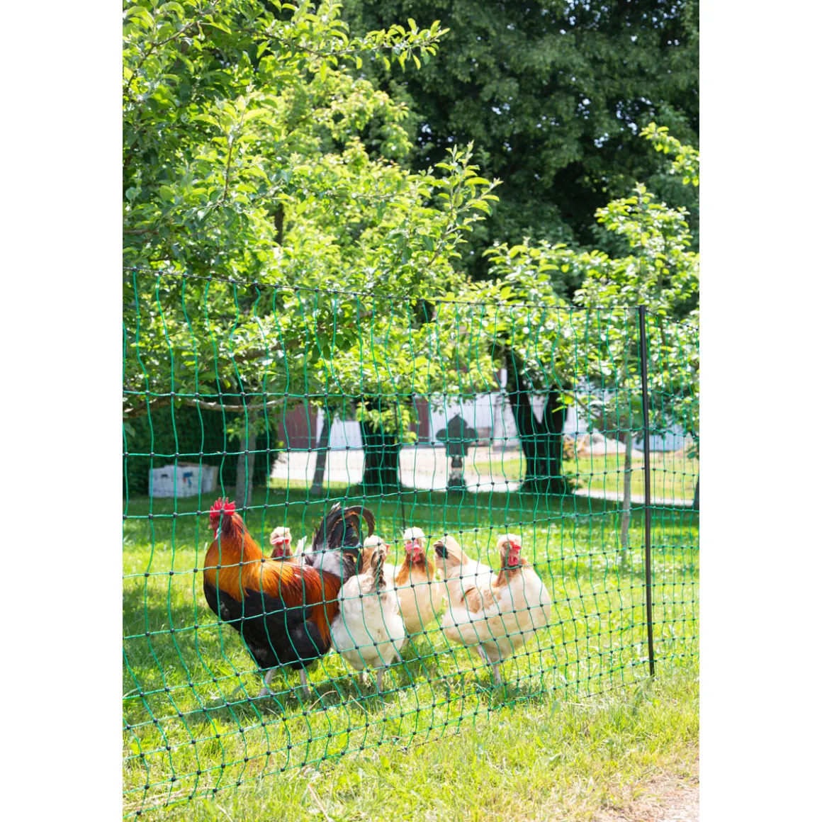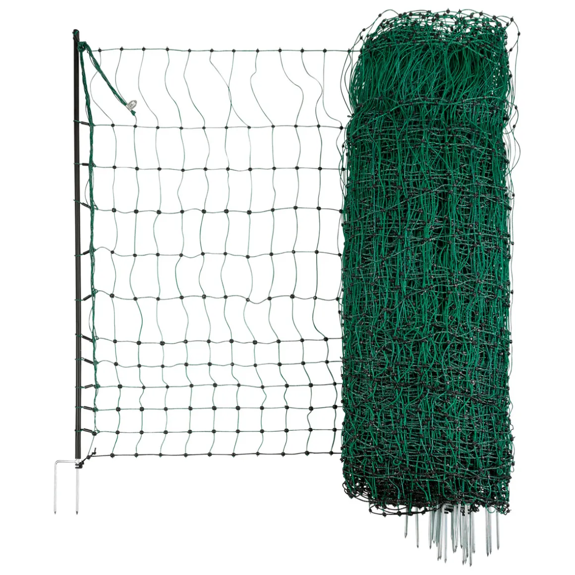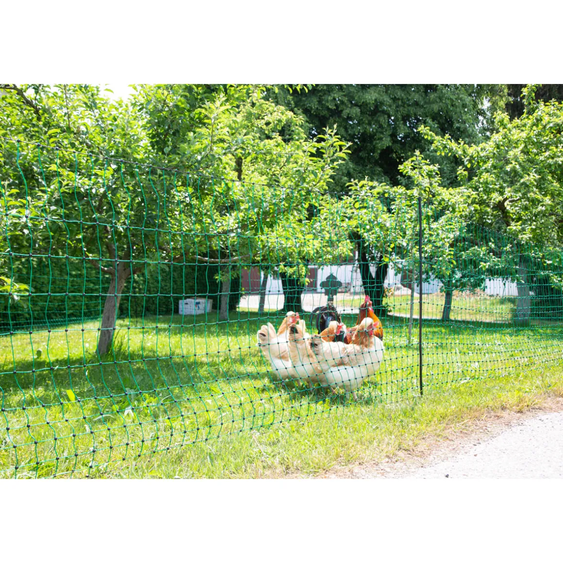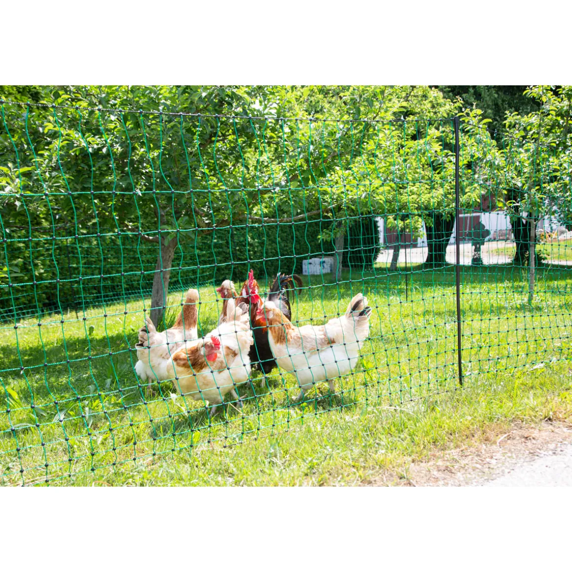 Sichern Sie Ihre Geflügel mit dem robusten und vielseitigen PoultryNet in dunkelgrün. Mit verstärkter Oberlitze, standfesten Kunststoffpfählen und geringer Maschenweite ist das Netz auch für Lämmer geeignet.