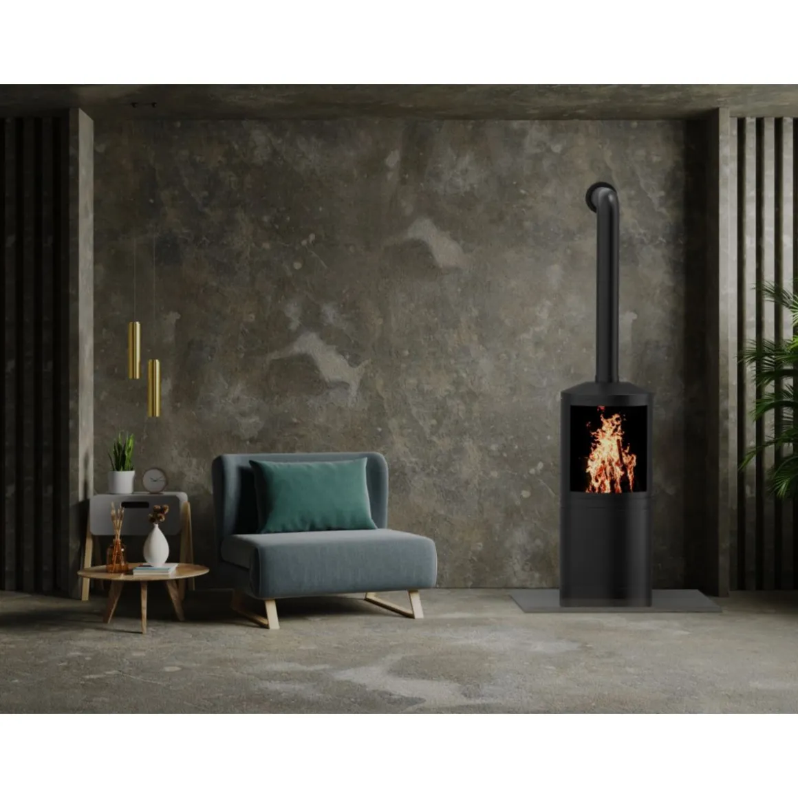 Der Kaminofen wirkt durch die ganzheitliche Positionierung auf dieser Glasbodenplatte wie ein Schmuckstück.
