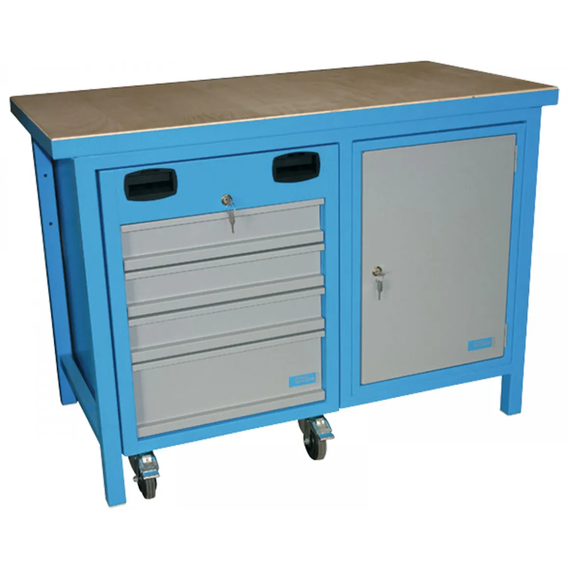 - Pulverbeschichtung in RAL5015 (Rahmenteile) und RAL7001 (Türen/Schubladen)