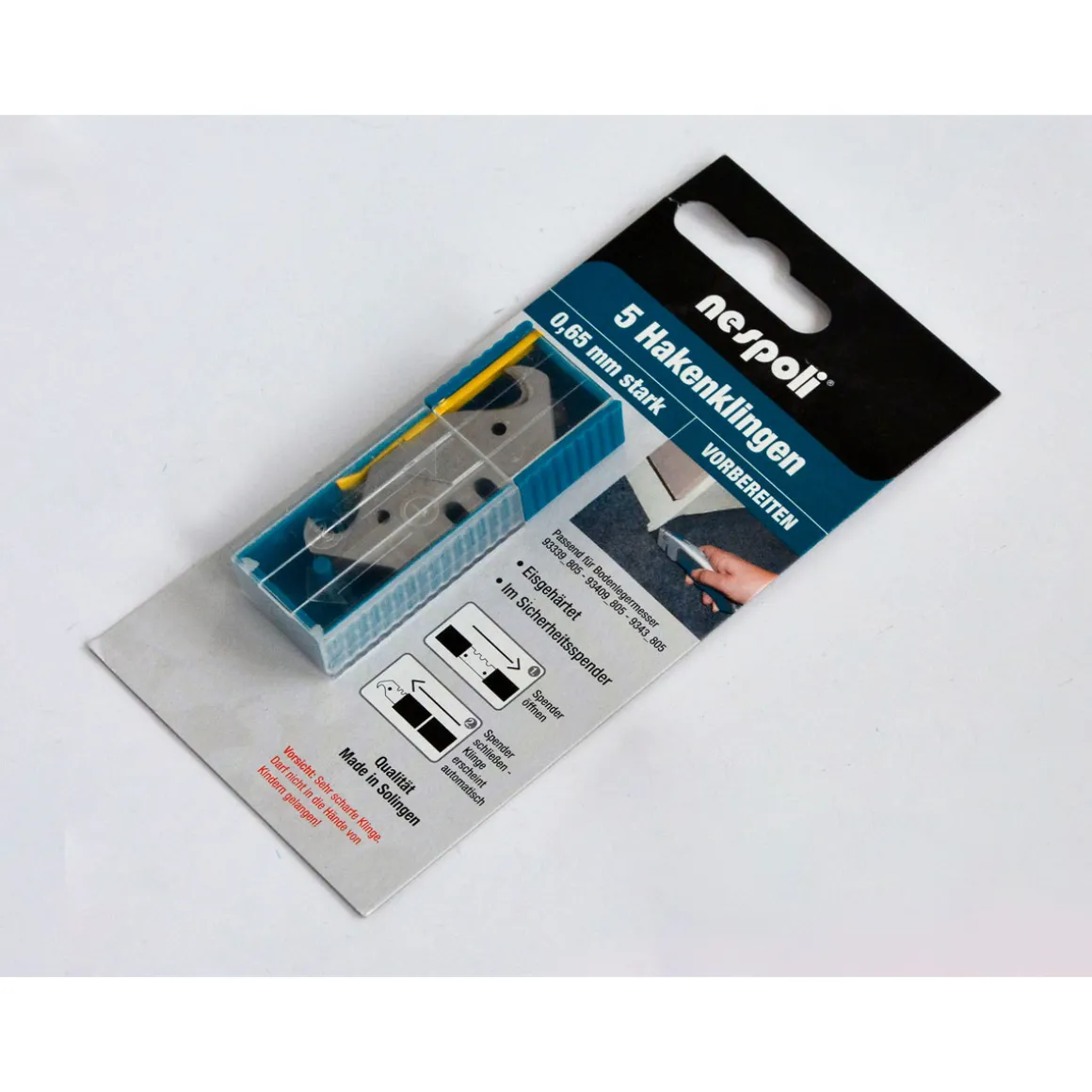 | Lieferumfang: | Hakenklingen 0,65 mm, 5 Stück im Sicherheitsspender |