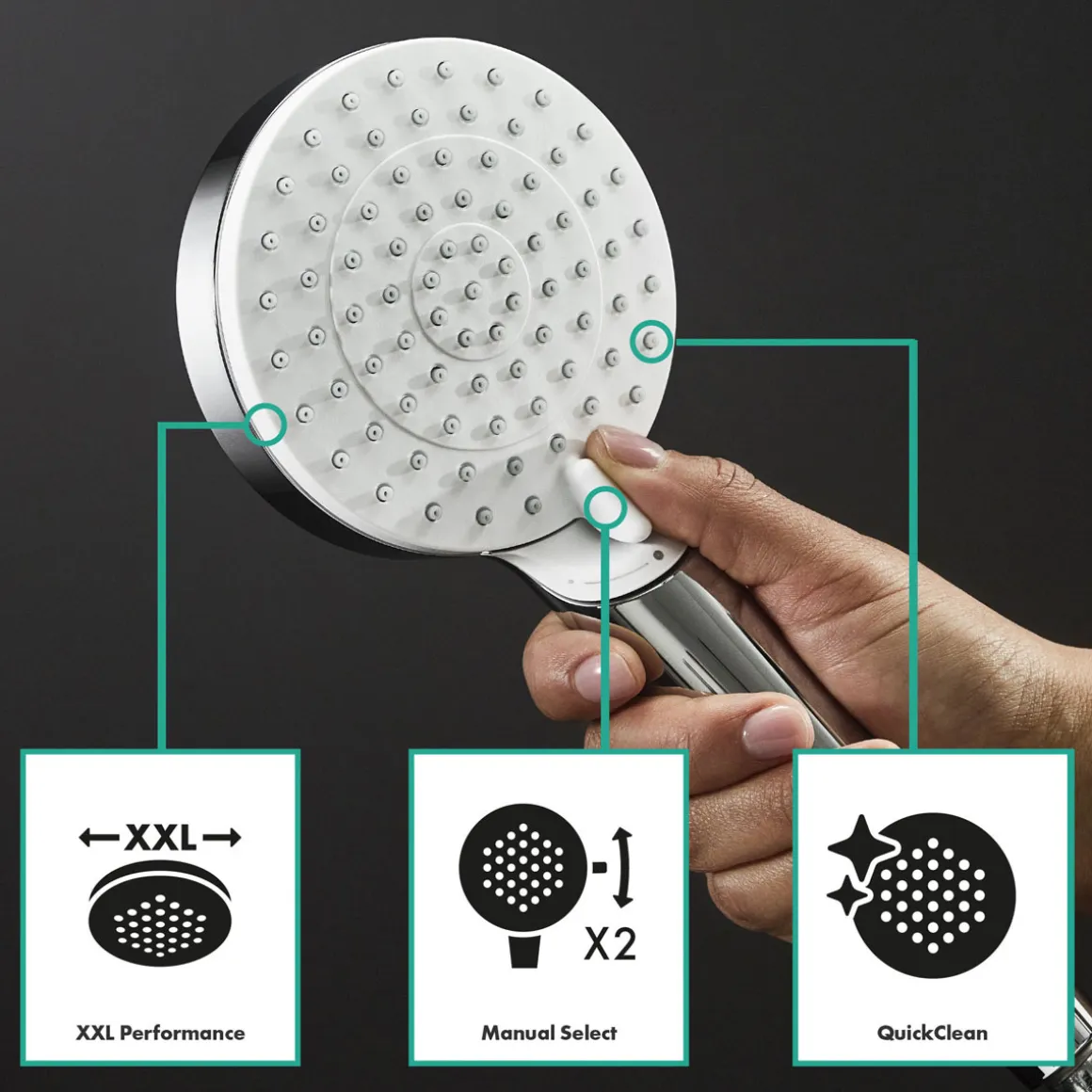 Großes Duschvergnügen mit wunderbar wohltuenden Strahlarten. Handbrausen und Kopfbrausen sorgen für XXL-Vergnügen. Denn sie hüllen den ganzen Körper in wahre Wasserträume ein.