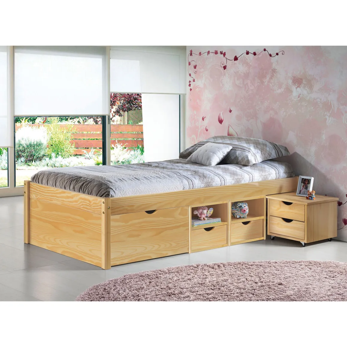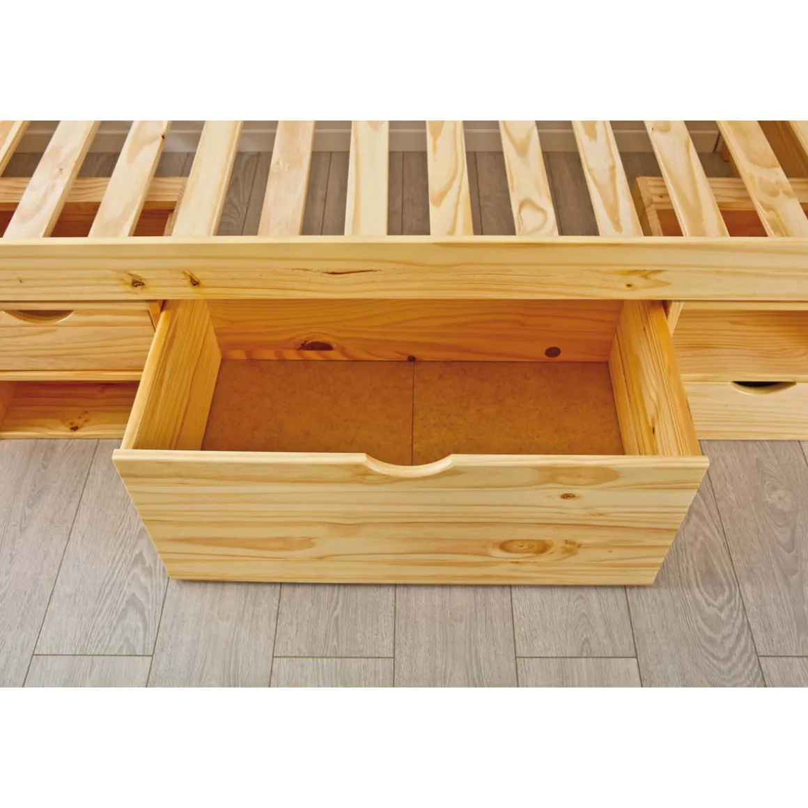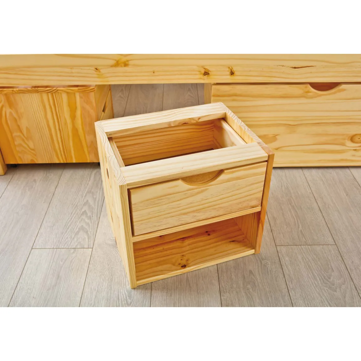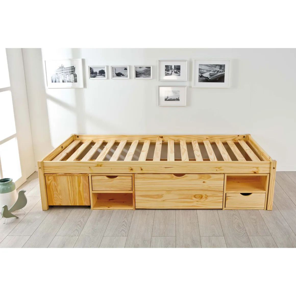 Das Funktionsbett eignet sich optimal für kleinere Räume wie z.B. Das Gästezimmer. Das Funktionsbett Claas ist besonders praktisch. Die Schubladen sind in einer Einheitsgröße und können nach Ihren wünschen angeordnet werden. Damit sich kein Staub unter dem Bett sammelt, ist das Funktionsbett voll verblendet. Das Bett ist mit 4 Schubladen, 2 Schubkästen, 12 Fachböden und 2 Nachtkommoden ausgestattet. Bettwäsche und andere Utensilien können einfach unter dem Bett verstaut werden. Die transparent lackierte Oberfläche (Natur) unterstreicht den warmen Naturholzcharakter. Die schadstoffarme Lackierung ist wasserabweisend und pflegeleicht. Das für die Fertigung von Claas verwendete Kiefer Massivholz erfüllt alle europäischen Qualitätsstandards nach neusten Richtlinien. Das solide Funktionsbett überzeugt mit einer hohen Beständigkeit und entsprechend professioneller Verarbeitung. Lattenrost enthalten: Ja. Aufgebaute Maße (BxTxH): 146 x 209 x 47,5 cm.