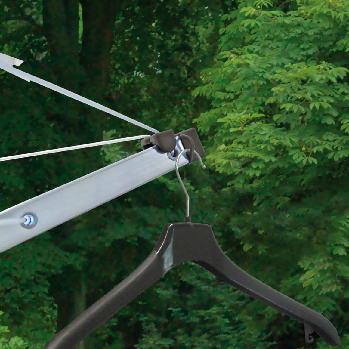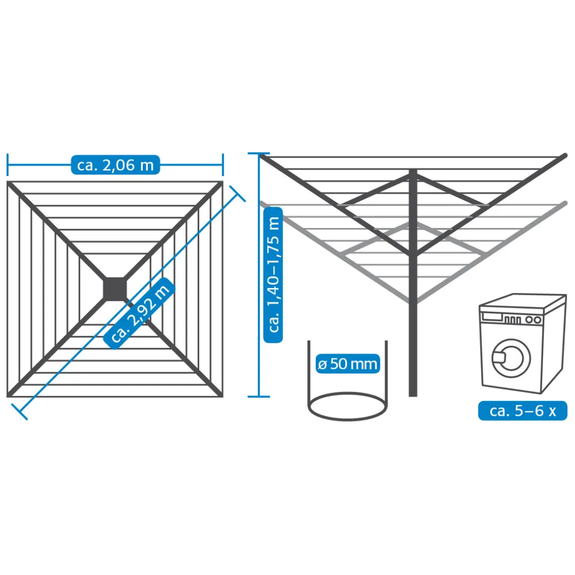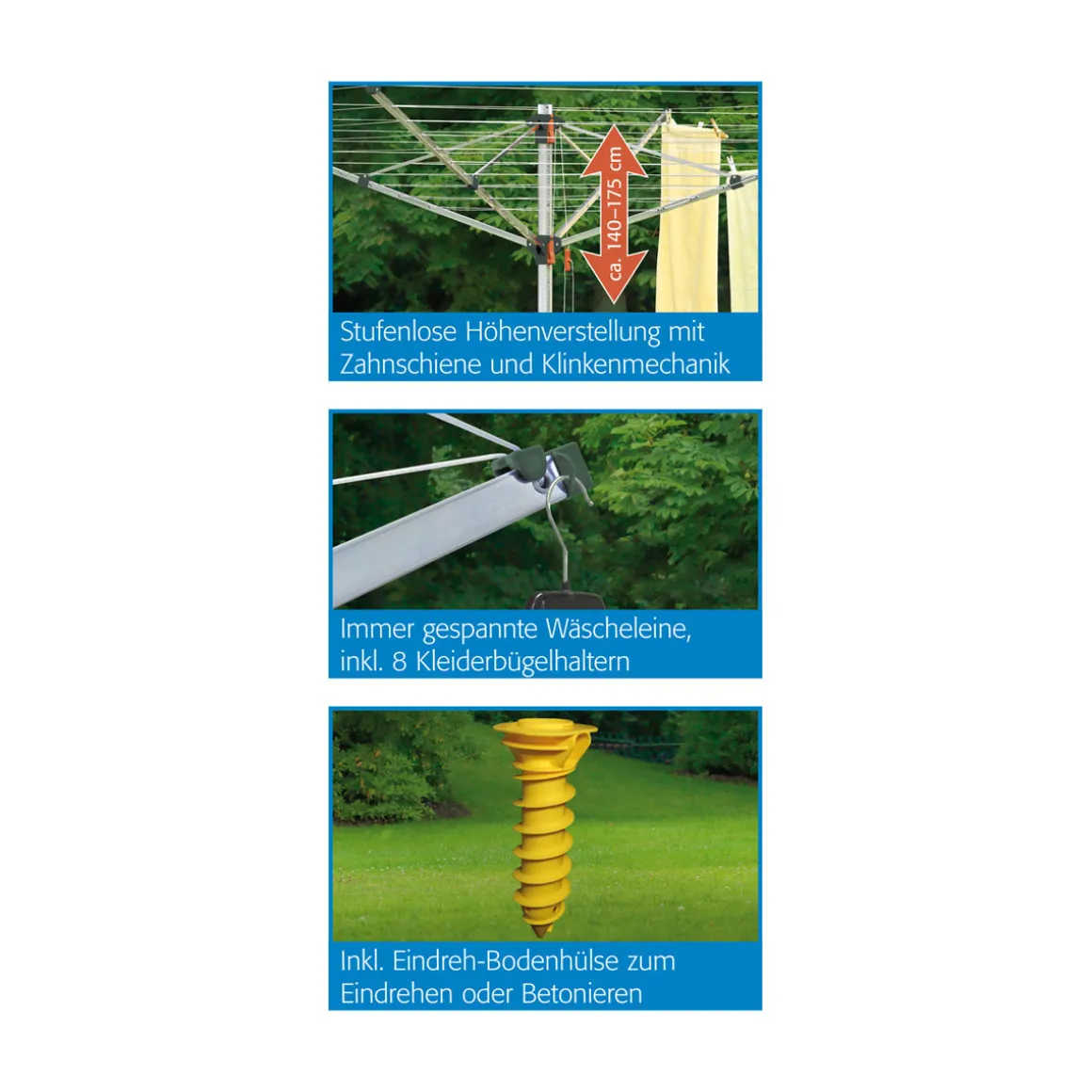 •Stabiles 50mm Standrohr und Rechteckprofilarme, permanente Wäscheleinenspannung durch patentierte Leinenklemmen, weiße, Kunststoffummantelte Leine, UV- und witterungsbeständige Kunststoffteile, inklusive Eindrehbodenhülse