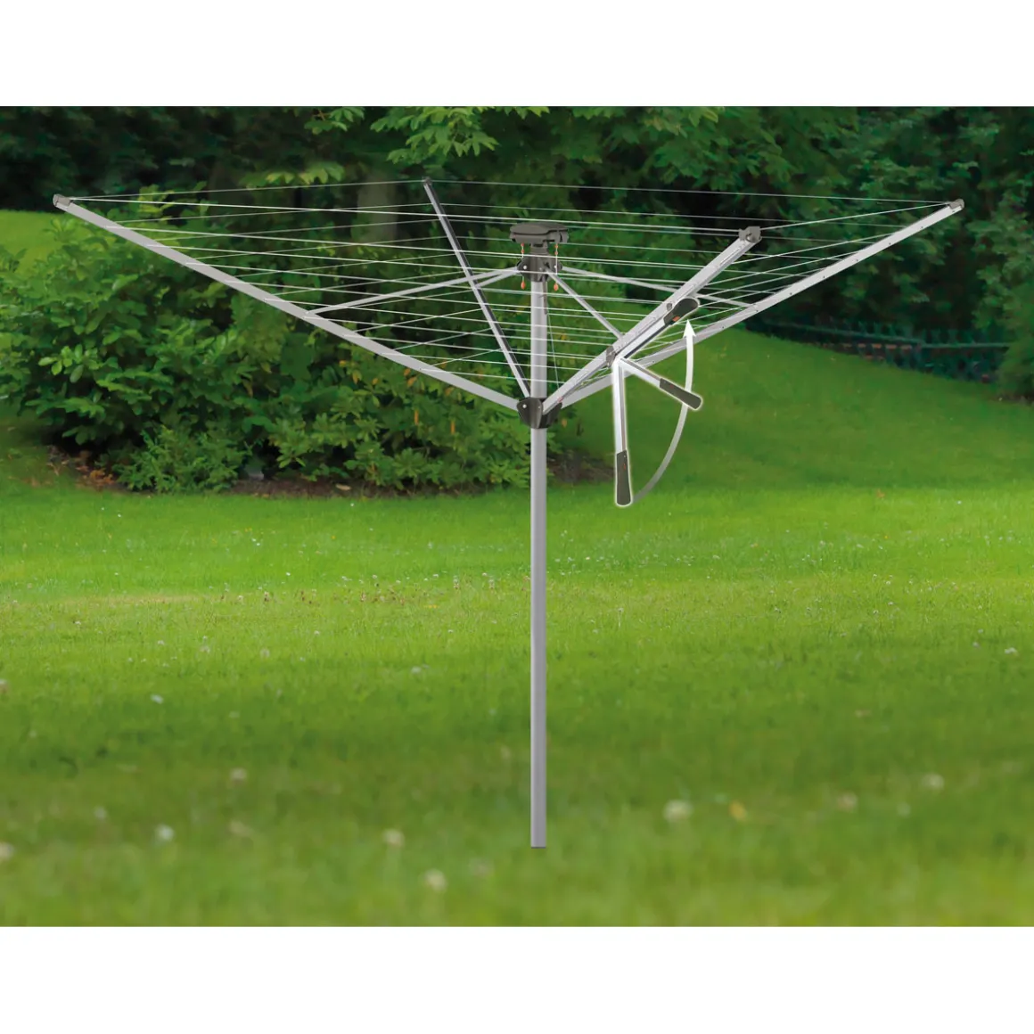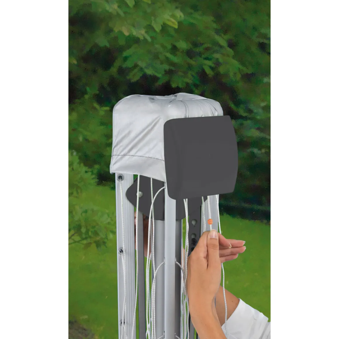 integrierte Schutzhülle mit Abdeckung für saubere Leinen, aus hochfestem, korrosionsfreiem aluminium, Stabiles 50mm Standrohr und verwindungssteife Doppelkastenprofilarme, permanente Wäscheleinenspannung durch patentierte Leinenklemmen, transparente Kunststoffummantelte Leine, UV- und witterungsbeständige Kunststoffteile, inklusive Eindrehbodenhülse