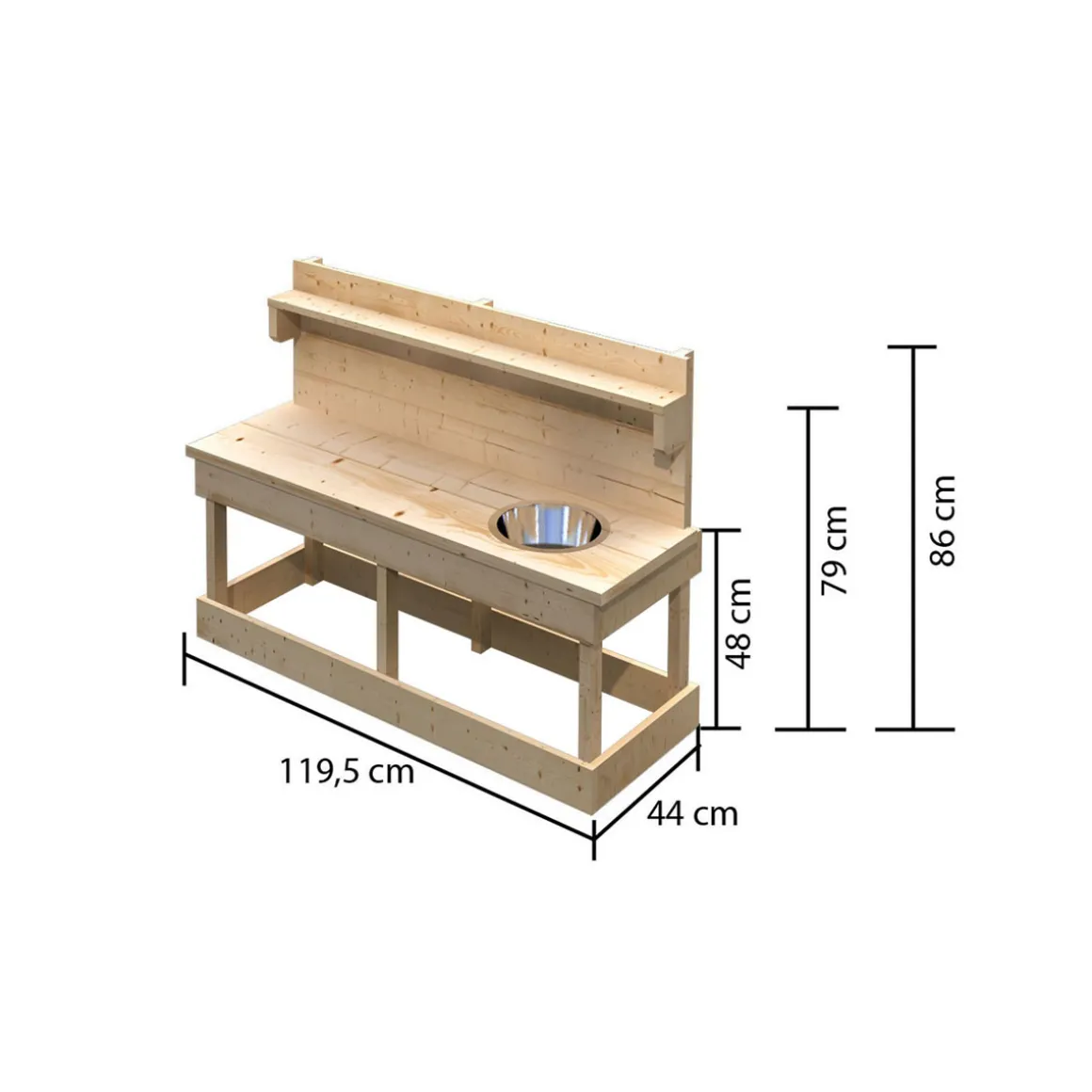 - Ausstattung: Edelstahltbecken für Wasser, Topfset, 6 Haken Ablage oben und unten für Spielsachen