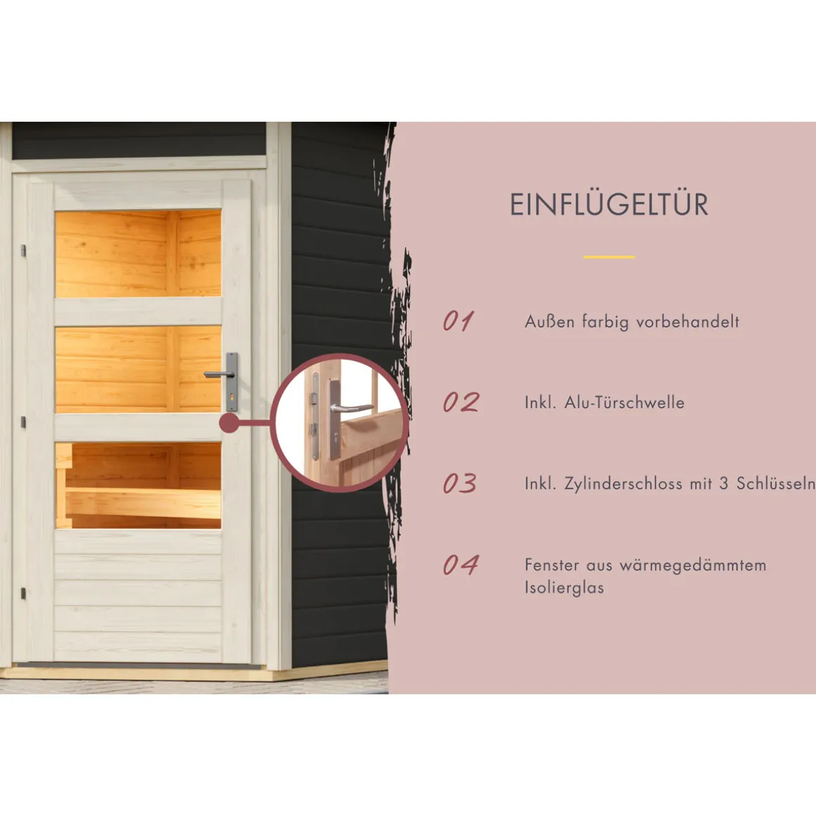 Karibu Saunahaus- Set „Mikka“ terragrau mit Ofen 9 kW ext. Steuerung