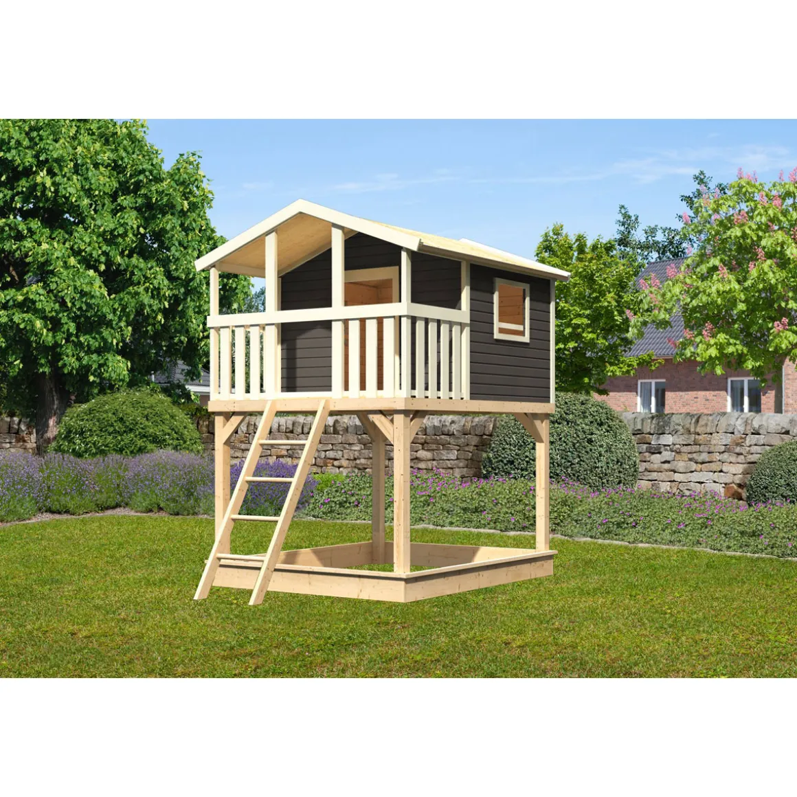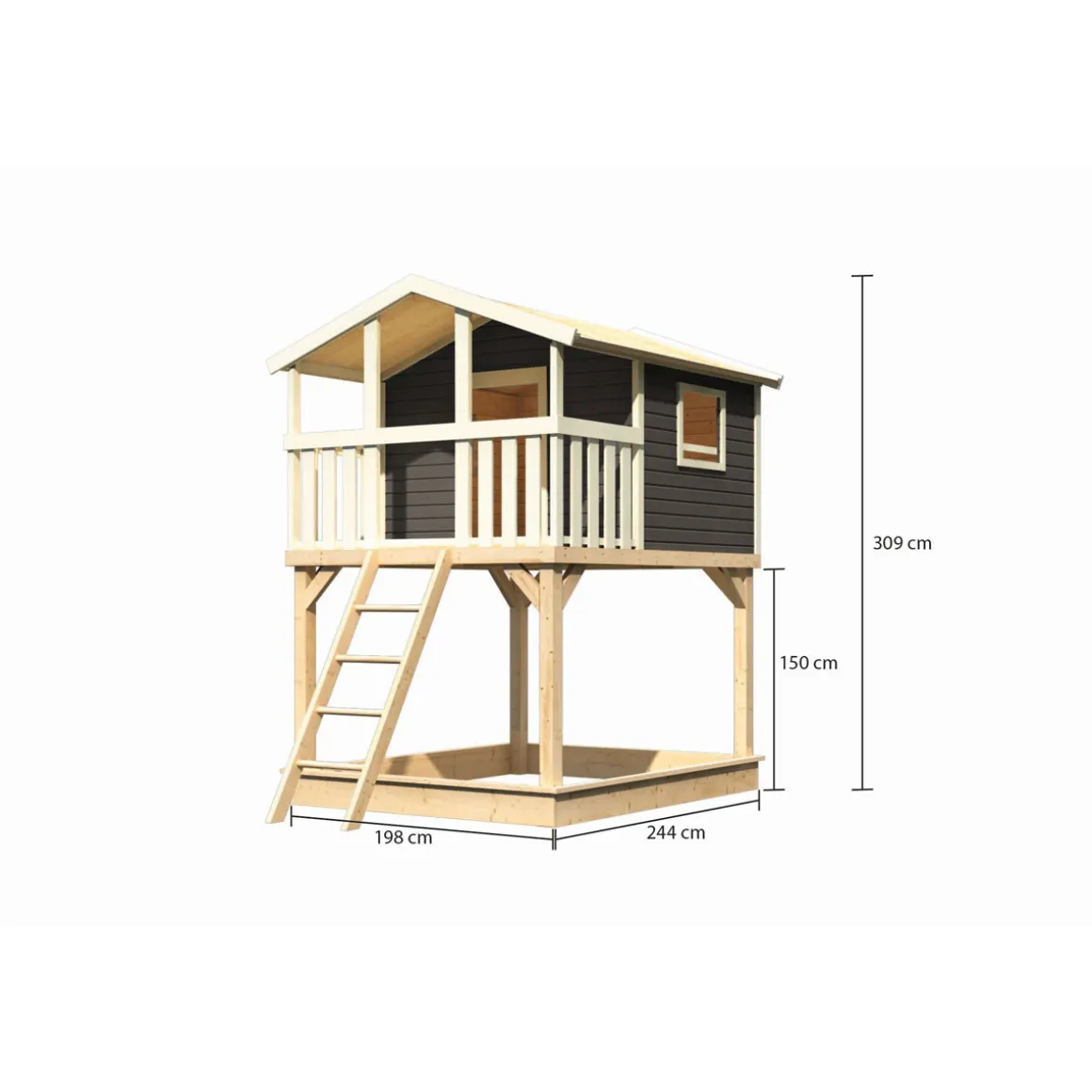 Dieses Stelzenhaus aus 19 mm starken Wandbrettern mit einer Podesthöhe von 150 cm beflügelt die Fantasie Ihrer Kinder. 4 Massivholzpfosten mit einer Stärke von 90×90 mm und Terrassen vor dem Haus mit Brüstung sorgen für viel Sicherheit für Ihre Kleinen. Im Lieferumfang ist eine Holzleiter enthalten, die den Zugang zur Terrasse vereinfacht. Das Außenmaß dieses Hauses beträgt 198x244x309 cm und bietet somit unglaublich viel Platz um die Fantasie anzukurbeln. Das Haus wird mit einem Satteldach aus Massivholzdach geschützt. Die 6 m² große Dachfläche bietet auch der Terrasse noch Schutz und sorgt für unbeschwertes Spielvergnügen, egal zu welcher Jahreszeit. Unsere Stelzenhäuser bieten mit einer Rutsche in vielen Farben sowie weiterem umfangreichem Zubehör alles, was das Kinderherz begehrt.