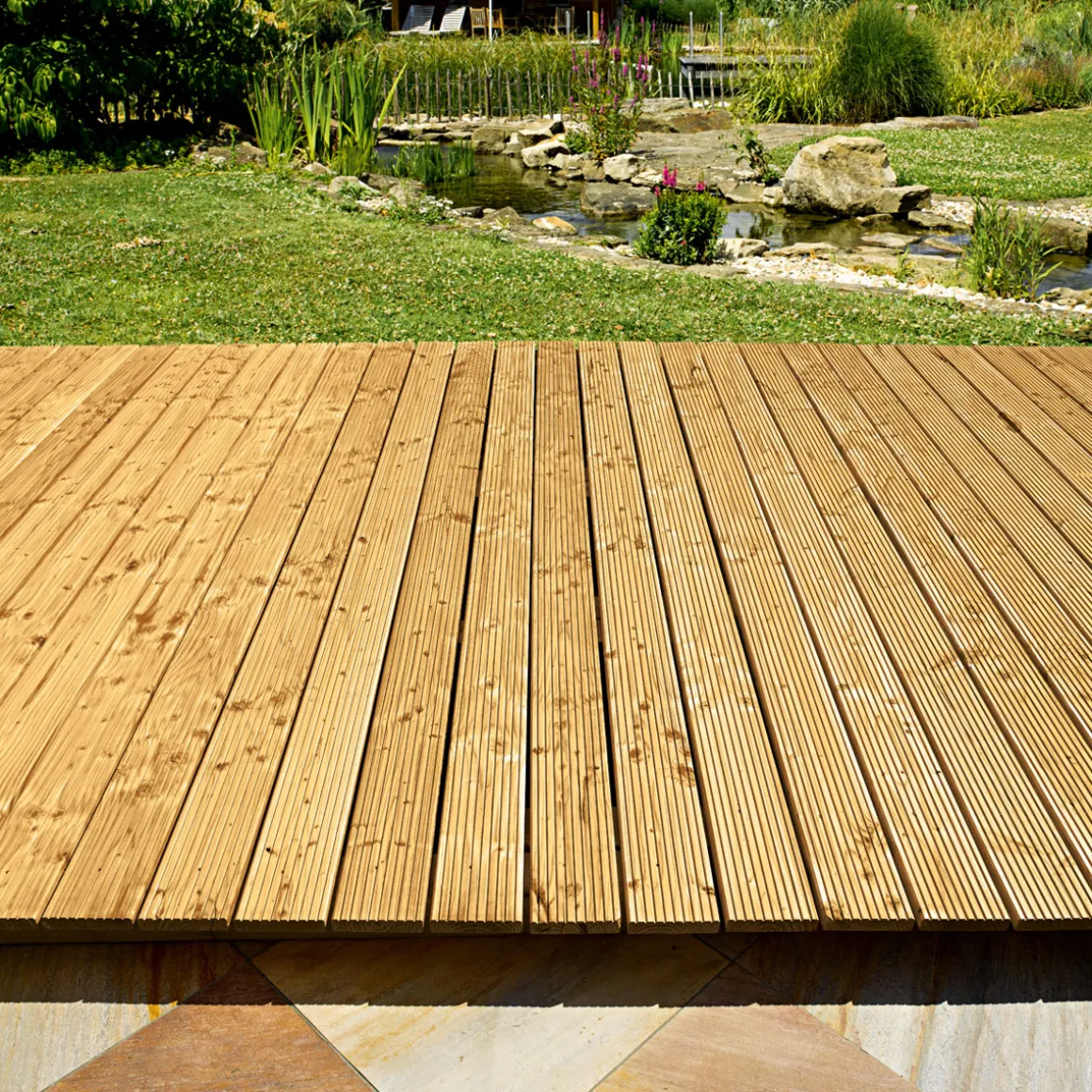 Erleben Sie mit der Kiefer-Terrassendiele ein Stück Natur auf Ihrer Terrasse. Die fein geriffelte/grob gehobelte Oberfläche sorgt für eine angenehme Haptik und eine natürliche Optik.