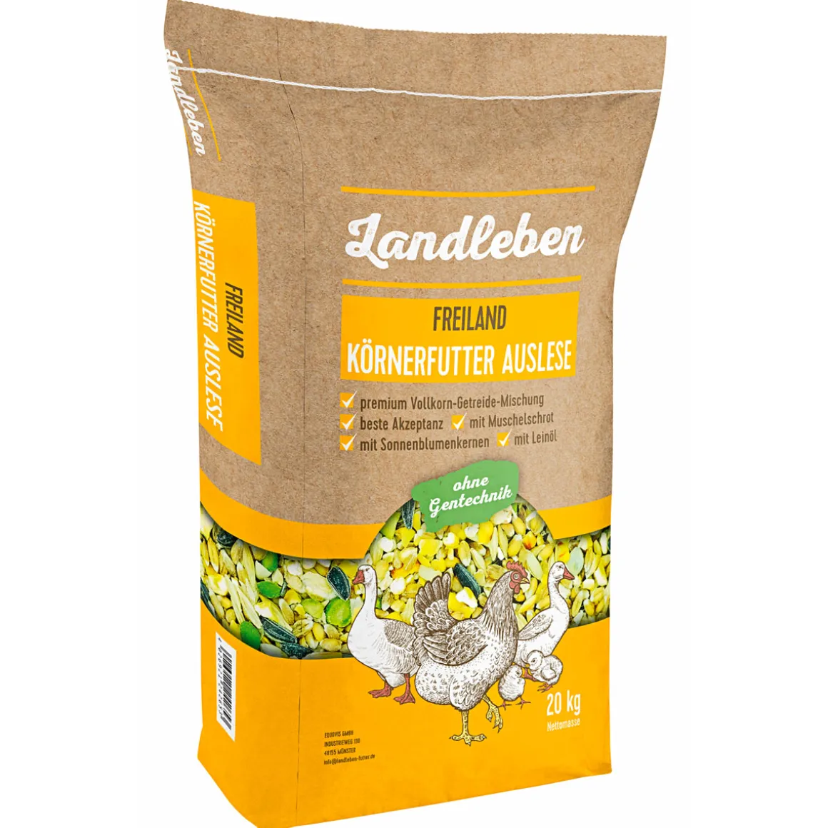 Landleben Freiland Körnerfutter Auslese ist eine Premium Vollkorn-Getreidemischung bestehend aus gereinigtem Getreide, gebrochenem Mais, gebrochenen Erbsen, Sonnenblumenkernen, Muschelschalen und Leinöl. Das mehrfahce gereinigte Ergänzungsfutter ist auf den speziellen Bedarf des gesamten Hofgeflügels abgestimmt. Besonders empfehlenswert ist Landleben Freiland Körnerfutter Auslese in Kombination mit Landleben Freiland LegeGold. Die Mischung bietet allen Geflügelarten, besonders auch Zwerghühnern, Enten, Gänsen, Tauben und Fasanen eine natürliche Futteralternative.