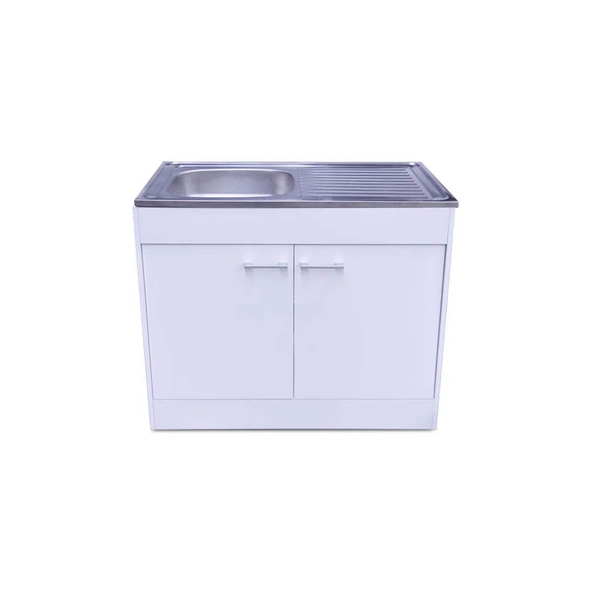 Die Komplettspüle ist vielseitig und universell einsetzbar. Ob in Küche, Hauswirtschaftsraum, im Keller oder in der Garage diese Komplettspüle ist das ideale Anstellmöbel. Der Unterschrank überzeugt durch eine geradlinige Formgebung und pflegeleichte Oberflächen. Dabei bietet Ihnen der hochwertige Spülenunterschrank ein helles freundliches Design in weiß. Die 100 cm breite Komplettspüle verfügt über eine Edelstahl-Auflagespüle inkl. Ablaufgarnitur, in der schnell ein kleiner Abwasch erledigt werden kann.