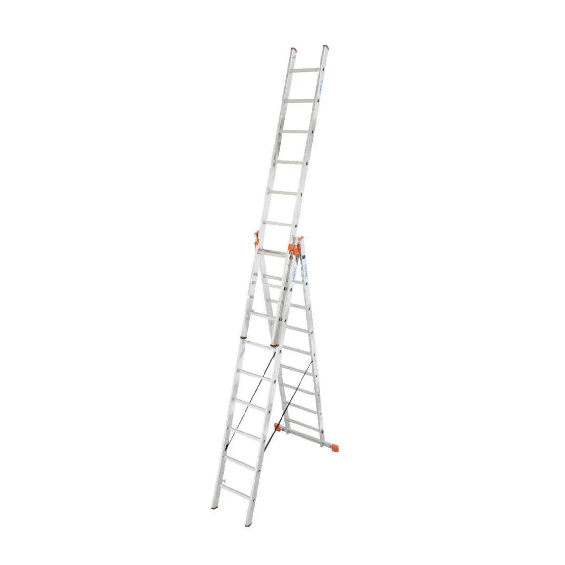 Die KRAUSE Vielzweckleiter Tribilo ist eine dreiteilige Gelenkleiter aus Aluminium mit geriffelten Stufen und einer Breiten Quertraverse. Sie ist vielseitig einsetzbar, witterungsbeständig und hat eine Tragfähigkeit von bis zu 150 kg. Mit einem Gewicht von nur 16,3 kg lässt sie sich leicht transportieren.