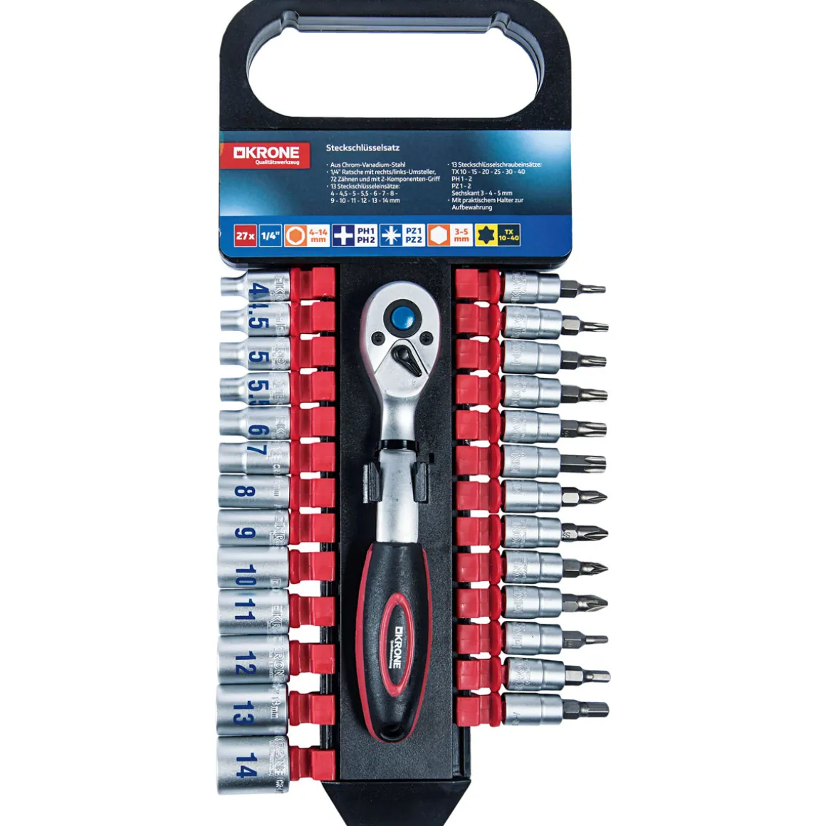 Mit dem Krone Steckschlüsselsatz haben Sie das passende Werkzeug immer griffbereit. Ob in der Hobbywerkstatt oder im professionellen Einsatz, dieser Satz lässt keine Wünsche offen.