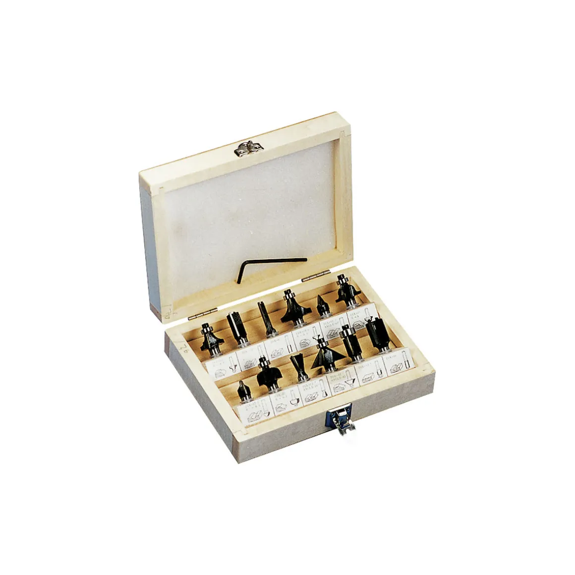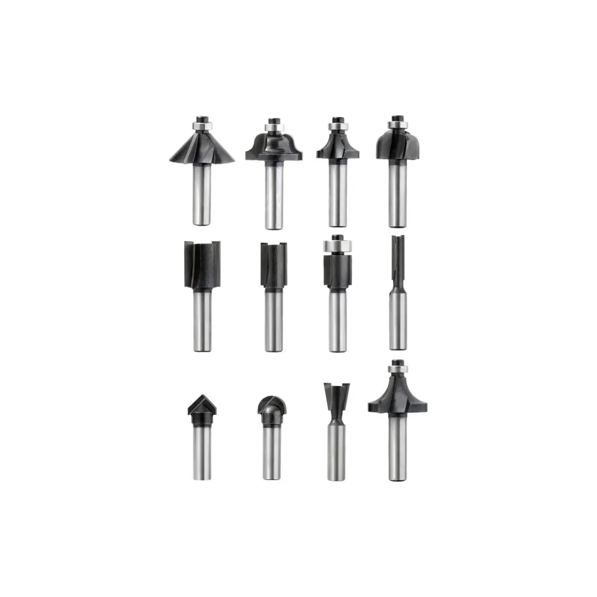 - Inhalt: Nutfräser in den Größen 6, 12 und 16 mm, V-Nutfräser mit einem Durchmesser von 12,7 mm, Hohlkehl- und Zinkenfräser sowie Bündig- und Abrundfräser in verschiedenen Größen
