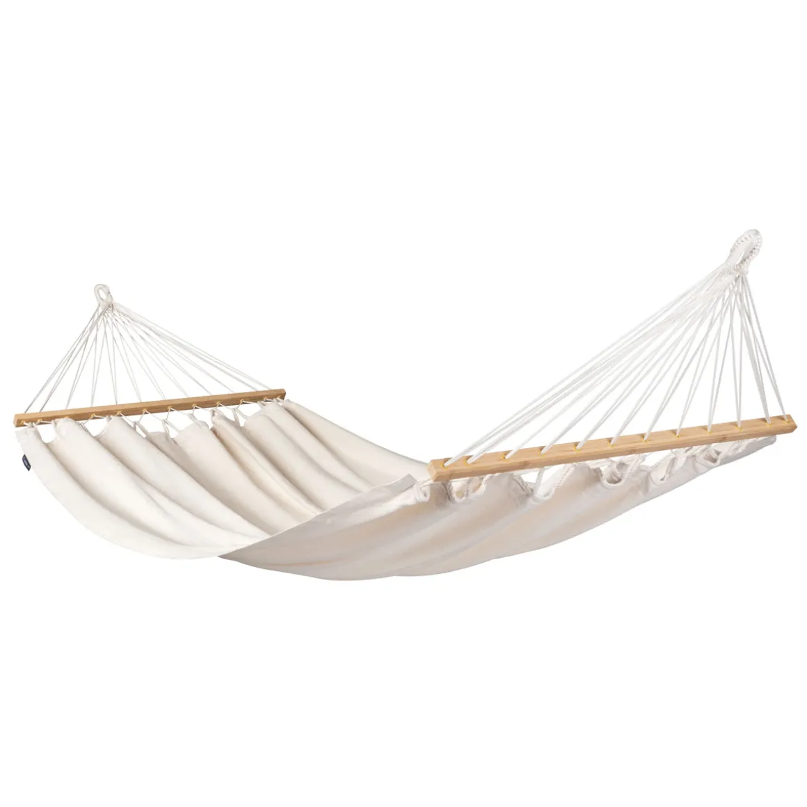 Entspannen Sie sich in der La Siesta Doppel-Stabhängematte Florencia Latte aus Bio-Baumwolle und genießen Sie den Komfort und die Qualität, die diese Hängematte bietet.