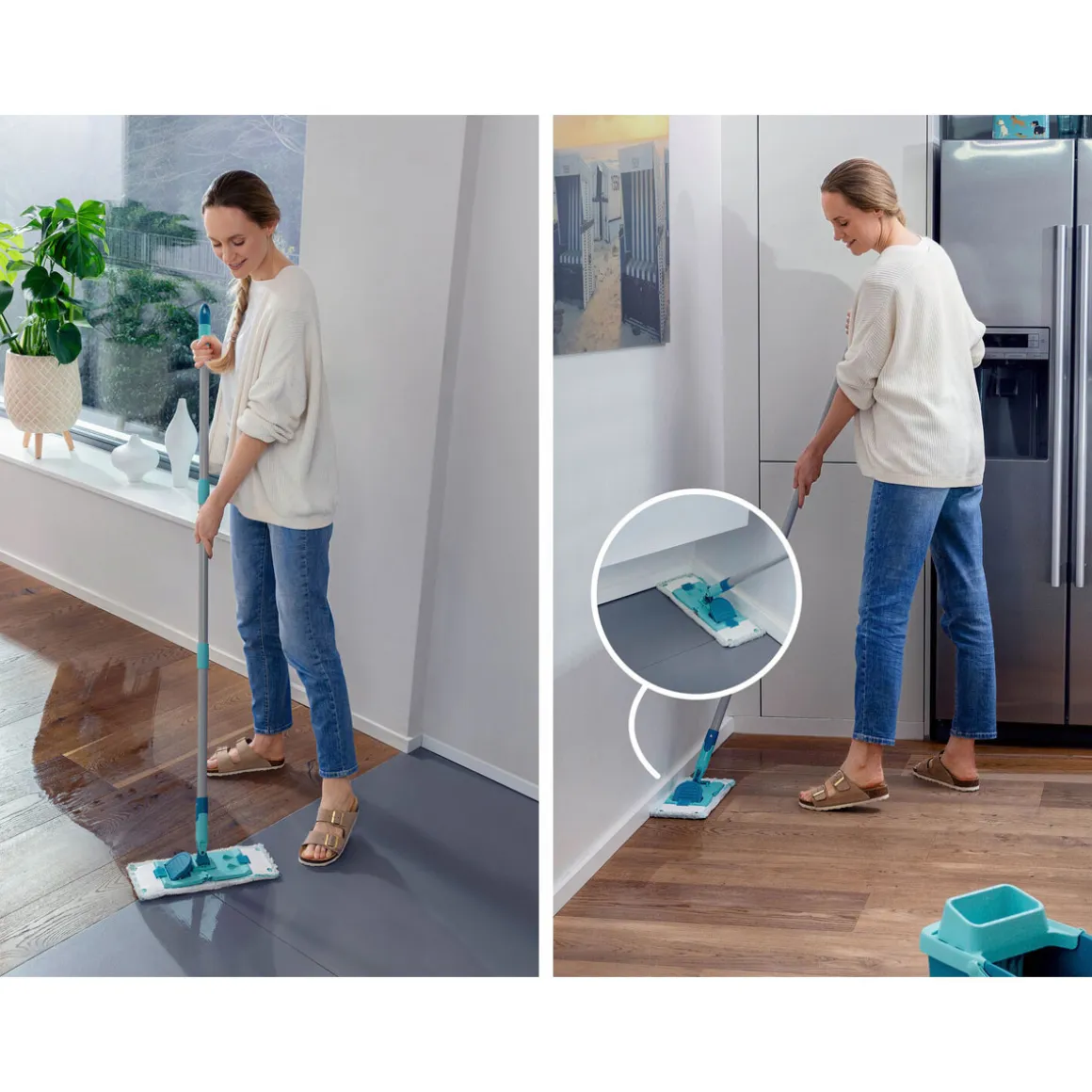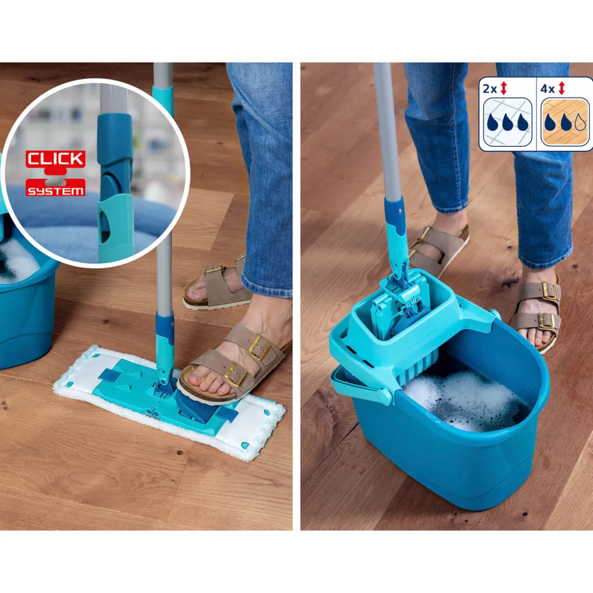 des Eimers gehört auch Kleckern beim Ausleeren der Vergangenheit an. Anschließend lässt sich der kompakte Eimer leicht verstauen. Das ClickSystem macht den Stahlstiel außerdem kompatibel mit vielen weiteren Reinigungstools und Wischern von Leifheit für Boden und Oberflächen. Wird