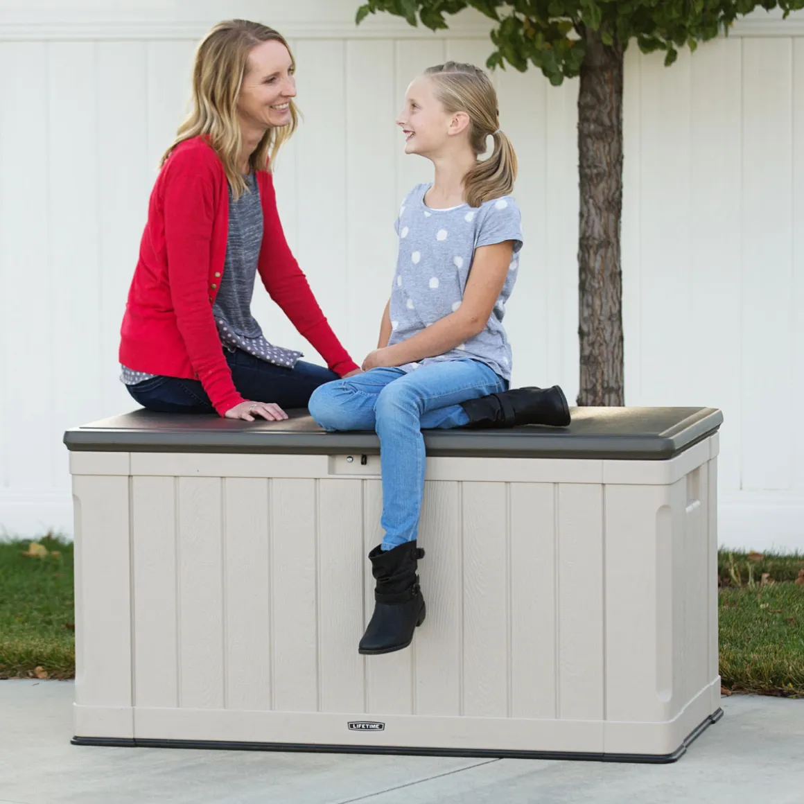 Die bessere Kissentruhe: unverwüstlich, wetterfest, 440l Stauraum. Diese extrem stabile Truhe aus Polyethylen-Kunststoff ist aufwändig in Wabentechnik gebaut. Durch die doppelwandige, 26 mm starke Konstruktion sind sowohl Wände als auch Deckel stabil versteift. So ist diese Truhe mit bis zu 300 kg belastbar! Perfekt auch als Anrichte für Ihr Büffet — und sogar als Sitzbank. Packt ca. 440l (statt üblicher 300-400 l). Kissen, Gartenutensilien, Spielsachen, Pool-Zubehör, … sind in der ganzjährig outdoor-tauglichen Truhe perfekt verstaut. Der Inhalt wird sauber und trocken gelagert. Nichts kann schimmeln, verschmutzen oder Stockflecken bilden. Gasdruckdämpfer halten den Deckel aufrecht. Der geöffnete Deckel bleibt im Winkel von 90° stehen und kann bequem heruntergedrückt werden. So ist die Truhe viel komfortabler zu öffnen und zu bestücken. In universell kombinierbarem Grau-Ton. Mit Vorhängeschloss-Vorrichtung. Wasserabweisend, 100 % UV-beständig, farbtreu und pflegeleicht abwaschbar.