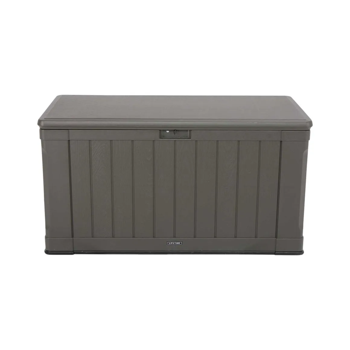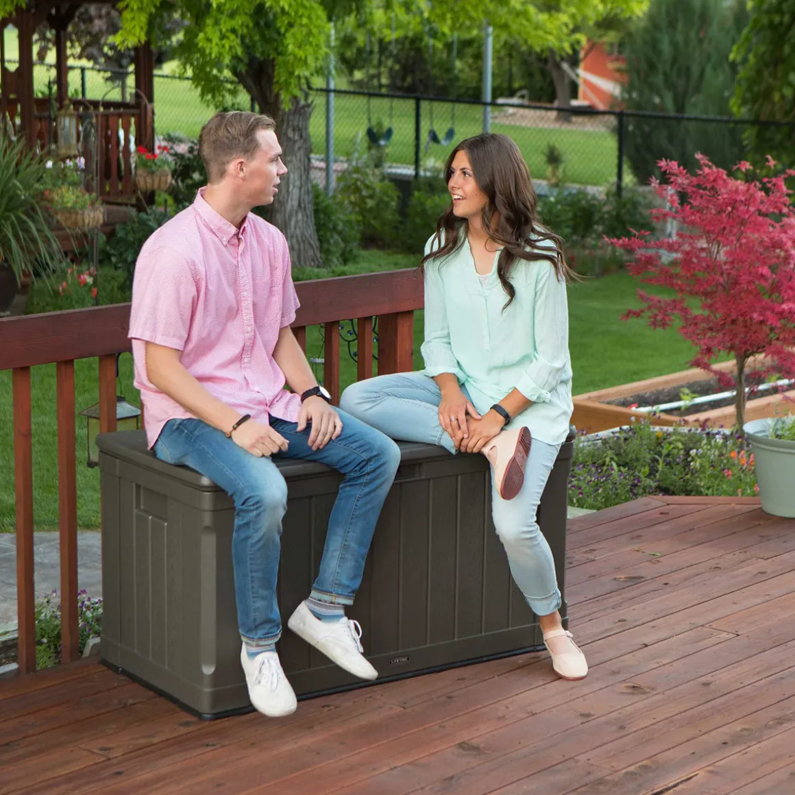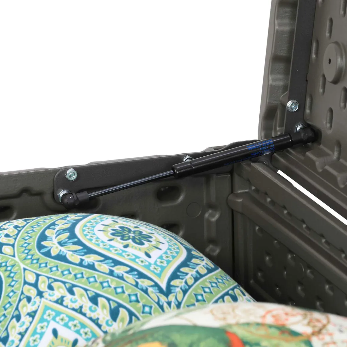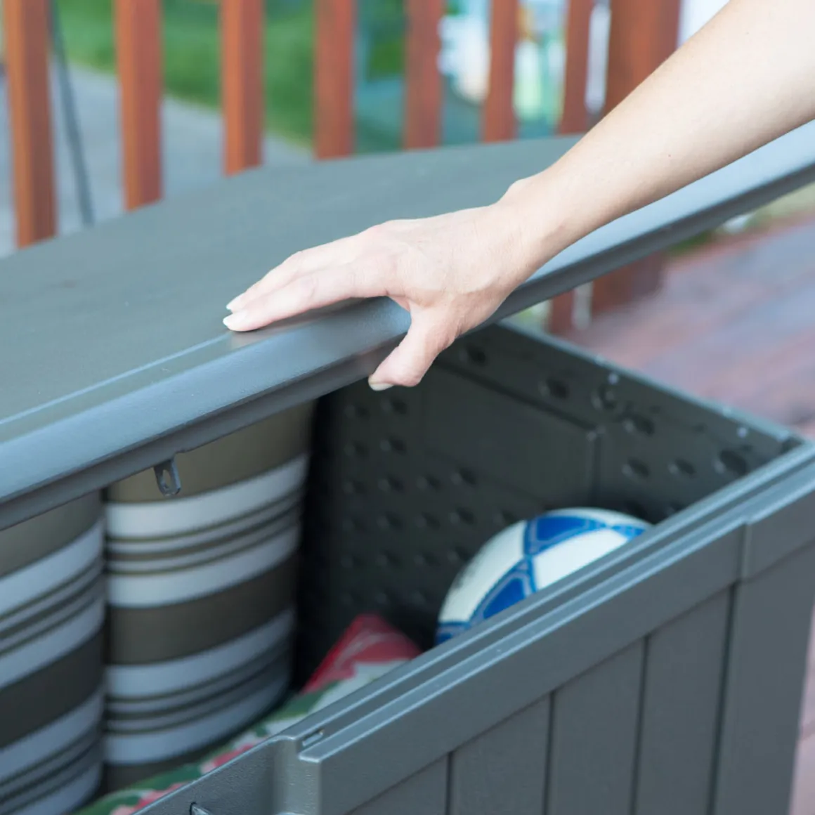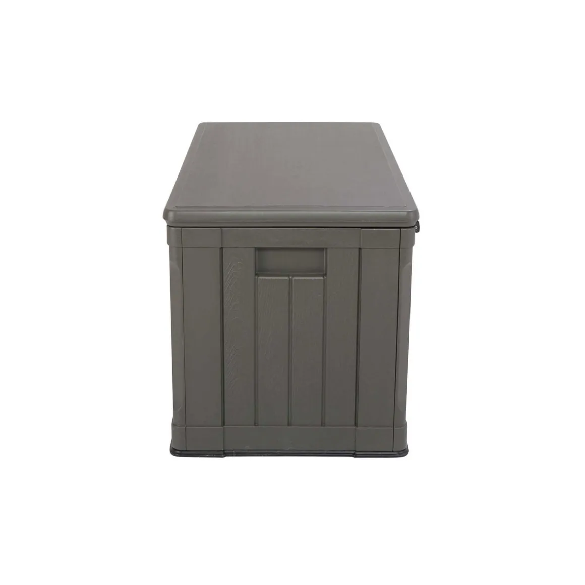 Die bessere Kissentruhe: unverwüstlich, wetterfest, 440l Stauraum. Diese extrem stabile Truhe aus Polyethylen-Kunststoff ist aufwändig in Wabentechnik gebaut. Durch die doppelwandige, 26 mm starke Konstruktion sind sowohl Wände als auch Deckel stabil versteift. So ist diese Truhe mit bis zu 300 kg belastbar! Perfekt auch als Anrichte für Ihr Büffet — und sogar als Sitzbank. Packt ca. 440l (statt üblicher 300-400 l). Kissen, Gartenutensilien, Spielsachen, Pool-Zubehör, … sind in der ganzjährig outdoor-tauglichen Truhe perfekt verstaut. Der Inhalt wird sauber und trocken gelagert. Nichts kann schimmeln, verschmutzen oder Stockflecken bilden. Gasdruckdämpfer halten den Deckel aufrecht. Der geöffnete Deckel bleibt im Winkel von 90° stehen und kann bequem heruntergedrückt werden. So ist die Truhe viel komfortabler zu öffnen und zu bestücken. In universell kombinierbarem Braun-Ton. Mit Vorhängeschloss-Vorrichtung. Wasserabweisend, 100 % UV-beständig, farbtreu und pflegeleicht abwaschbar.