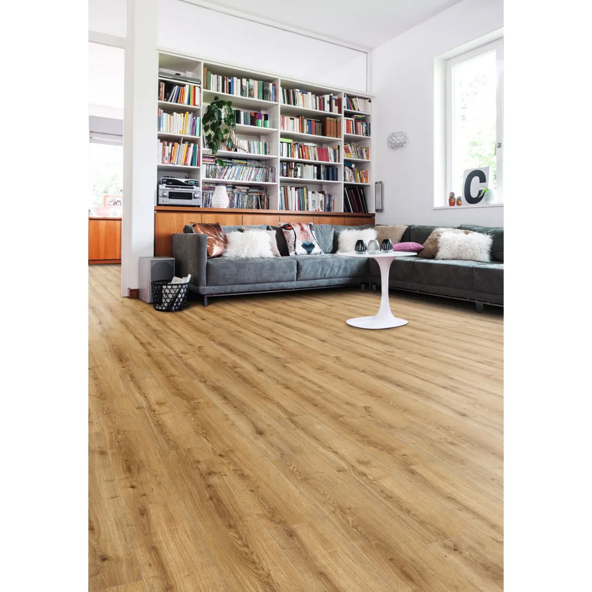 Der Boden überzeugt mit seiner authentischen Landhausdielen-Optik in einem natürlichen Eichendekor. Der mittelbraune Farbton sorgt für eine zeitlose Eleganz in jedem Raum.
