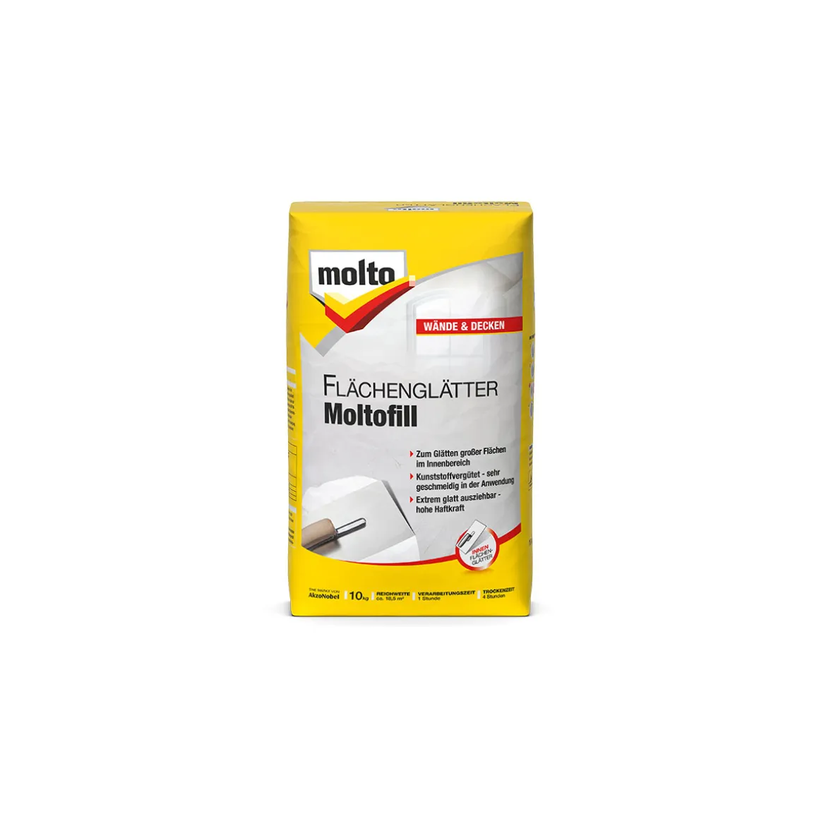 Molto Flächenglätter Moltofill ist ideal zum Glätten von rauen, unebenen Wand- und Deckenflächen im Innenbereich. Das Pulver lässt sich mit Wasser leicht anrühren, der extrem glatt ausziehbar ist. Anwendungsbereiche: alle trockenen, festen, saugfähigen und tragfähigen Untergründe wie z. B. Putz, Gips, Kalkputz, Beton und Gipskartonplatten.