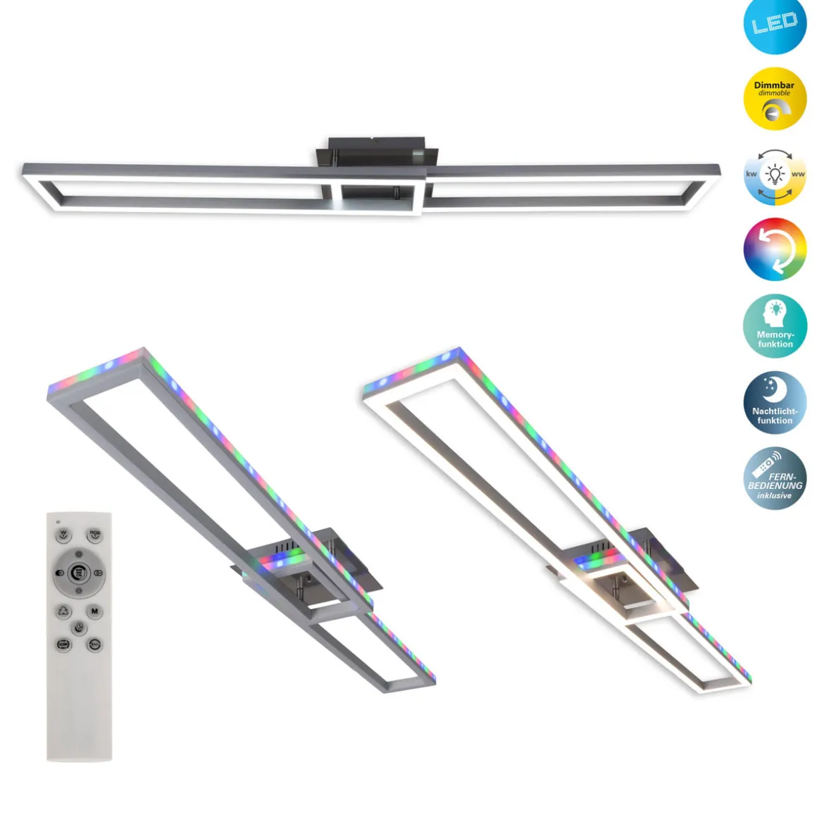 Verleihen Sie Ihrem Zuhause mit der BANTRY Deckenleuchte das gewisse Etwas. Mit einer Deckenleuchte kann ein Raum optimal ausgeleuchtet werden. Sie verbreitet das Licht gleichmäßig und erreichen jede Ecke, was eine freundliche und lichtdurchflutete Atmosphäre erzeugt. Der Look dieser Leuchte im Modern Style wird durch ihre kantige Gestaltung gekonnt unterstrichen. Perfekt für alle, die es schlank und edel mögen! Egal ob im Wohnzimmer, Schlafzimmer oder Büro – diese aluminiume Leuchte aus Metall und Kunststoff sorgt für einen Blickfang. Das gebürstete Gestell und der durchsichtige, klare Schirm bilden eine perfekte Einheit. Die Deckenleuchte misst 115 cm in der Länge, 20 cm in der Breite und 8,5 cm in der Höhe. Mit 1 LED Platine, bestückt mit 1 LED, sorgt diese Deckenleuchte für ein schönes Licht in Ihrem Zuhause. Die Lichtquelle ist fest integriert. Dieses Produkt ist ideal für den Innenbereich, da es über die Schutzklasse Klasse 1 und die Schutzart IP20 verfügt. Darüber hinaus trägt es das CE+RoHS-Auszeichnung und Prüfzeichen, was seine hohe Qualität und Sicherheit belegt. Für den Netzbetrieb dieses Geräts wird eine Netzspannung von 220-240V ~ 50Hz benötigt. Die 33 Watt starke Leuchte liefert Ihnen 2000 Lumen um den Raum zu beleuchten. 6600 Kelvin Lichttemperatur ergeben eine gute und funktionelle Beleuchtung. Diese Deckenleuchte ist mit einer CCT-Technologie und RGB Technologie ausgestattet, die es ermöglicht, die Lichtfarbe und -intensität zu regulieren. Diese Funktion ermöglicht es, den Raum mit dem perfekten Licht zu beleuchten. Diese Deckenleuchte bietet mehr als nur gutes Licht: Sie ist mit einer Nachtlichtfunktion ausgestattet, die ein gedämmtes Licht abgibt, welches sich ideal für den Einsatz in Schlafzimmern eignet.