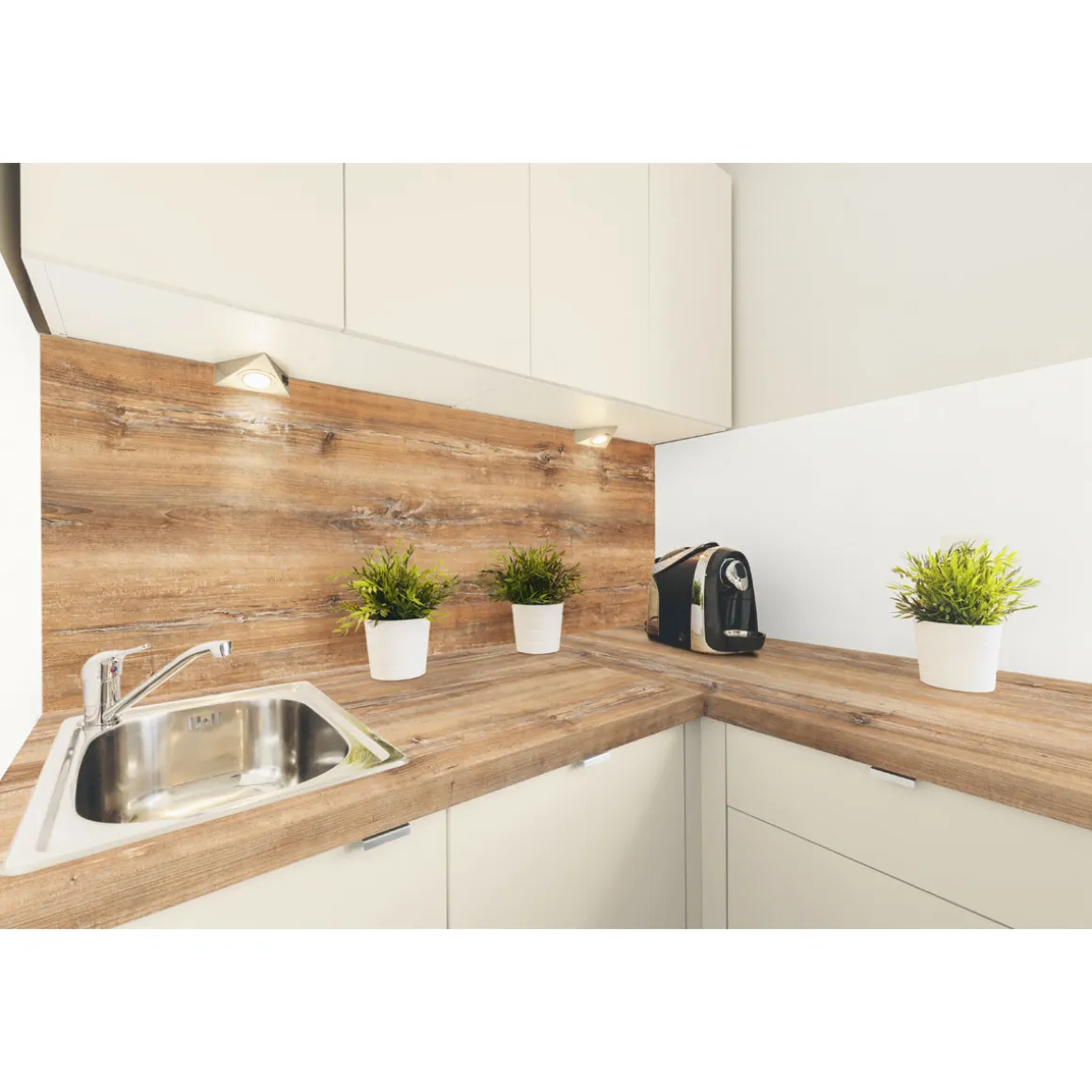 Nischenrückwandplatte Sonoma Eiche, beidseitig verwendbar, pflegeleichter Fliesenersatz, hohe Kratzbeständigkeit und Stoßbeanspruchung.
