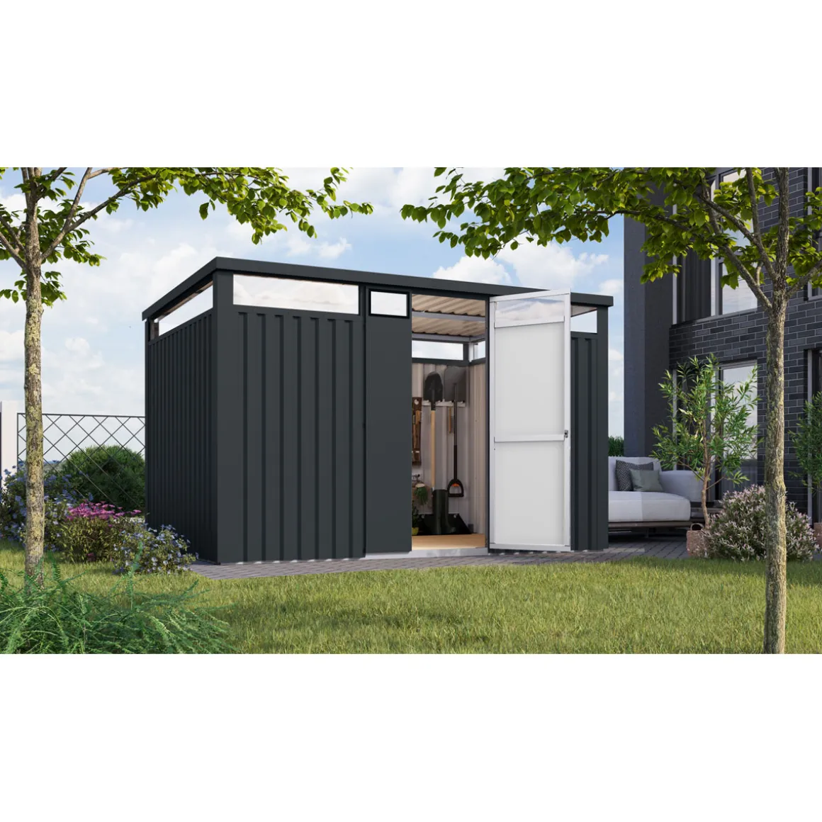 - Langlebig und stabil durch Verwendung von Metall an Ecken und Dach