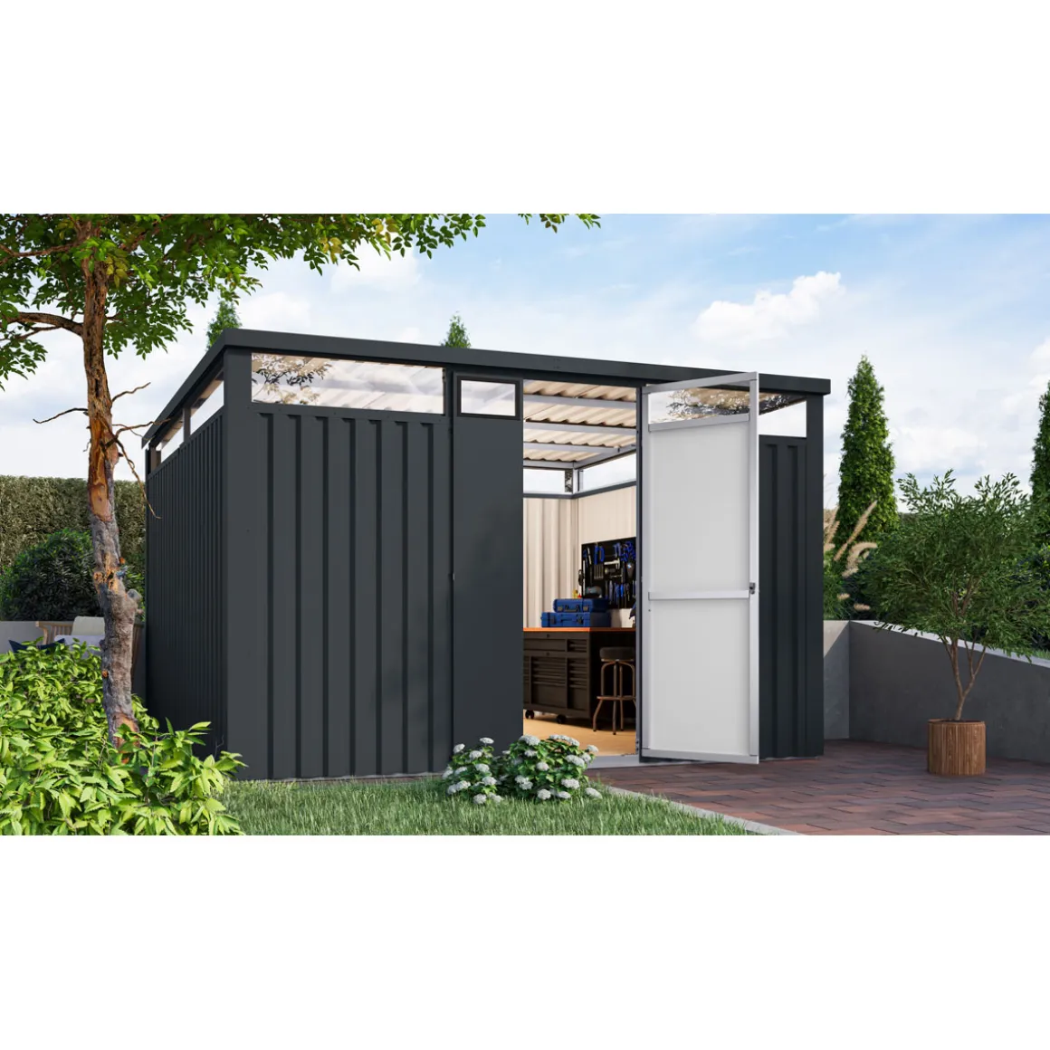 - Langlebig und stabil durch Verwendung von Metall an Ecken und Dach