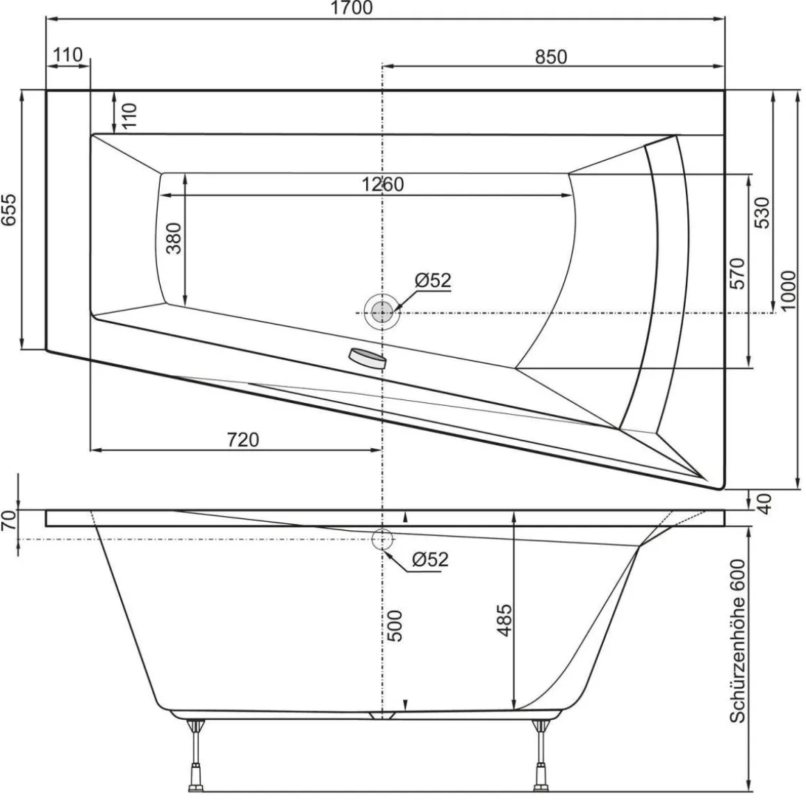 Ottofond Badewanne Galia I Modell A 1700 x 1000 x 655 mm weiß