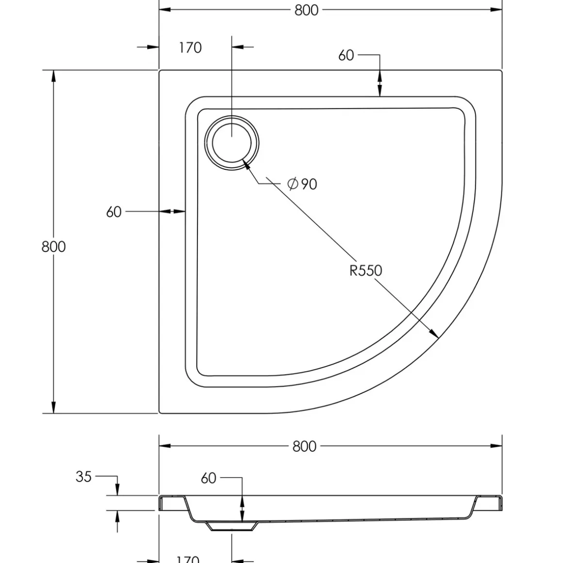 - Form Wanne: Viertelkreis, Radius: 550 mm