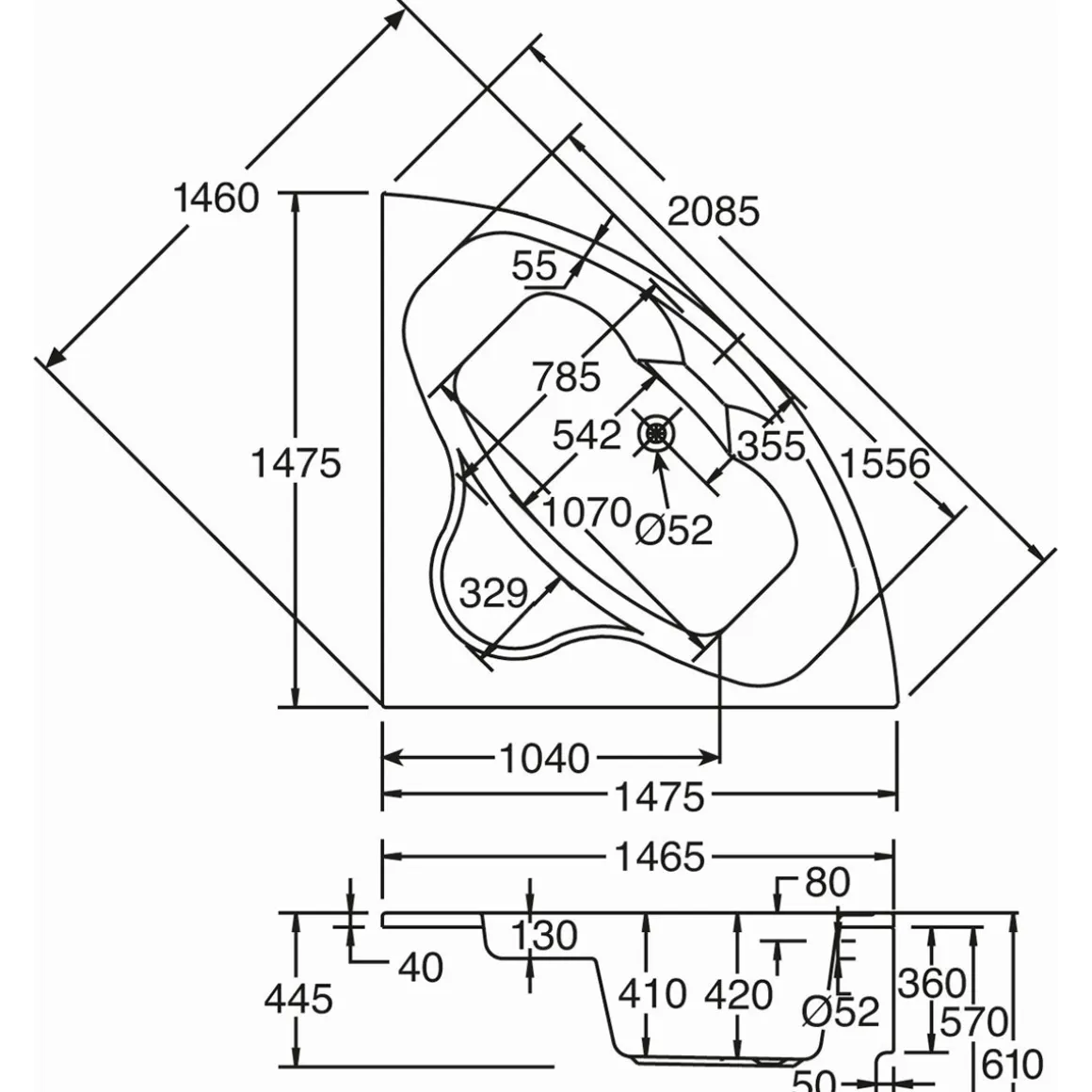- Ablaufposition seitlich mittig mit einem Durchmesser von 52 mm