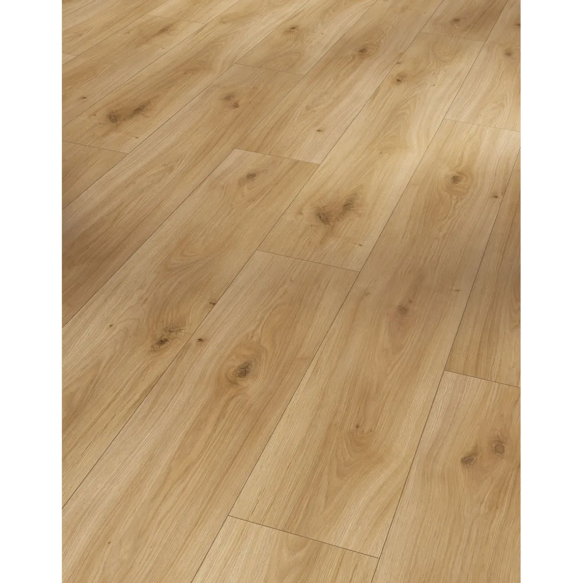 Ein Boden, der Ihre Wohnträume wahr werden lässt! Der Parador Laminatboden Basic 400 in Eiche Horizont Natur verleiht Ihren Räumen eine unvergleichliche Eleganz und Wärme. Mit seiner seidenmatten Struktur und dem natürlichen Eiche-Dekor schafft er eine Atmosphäre zum Wohlfühlen. Die umlaufende Fase sorgt für ein authentisches Landhausdielen-Design, das jeden Raum optisch aufwertet.