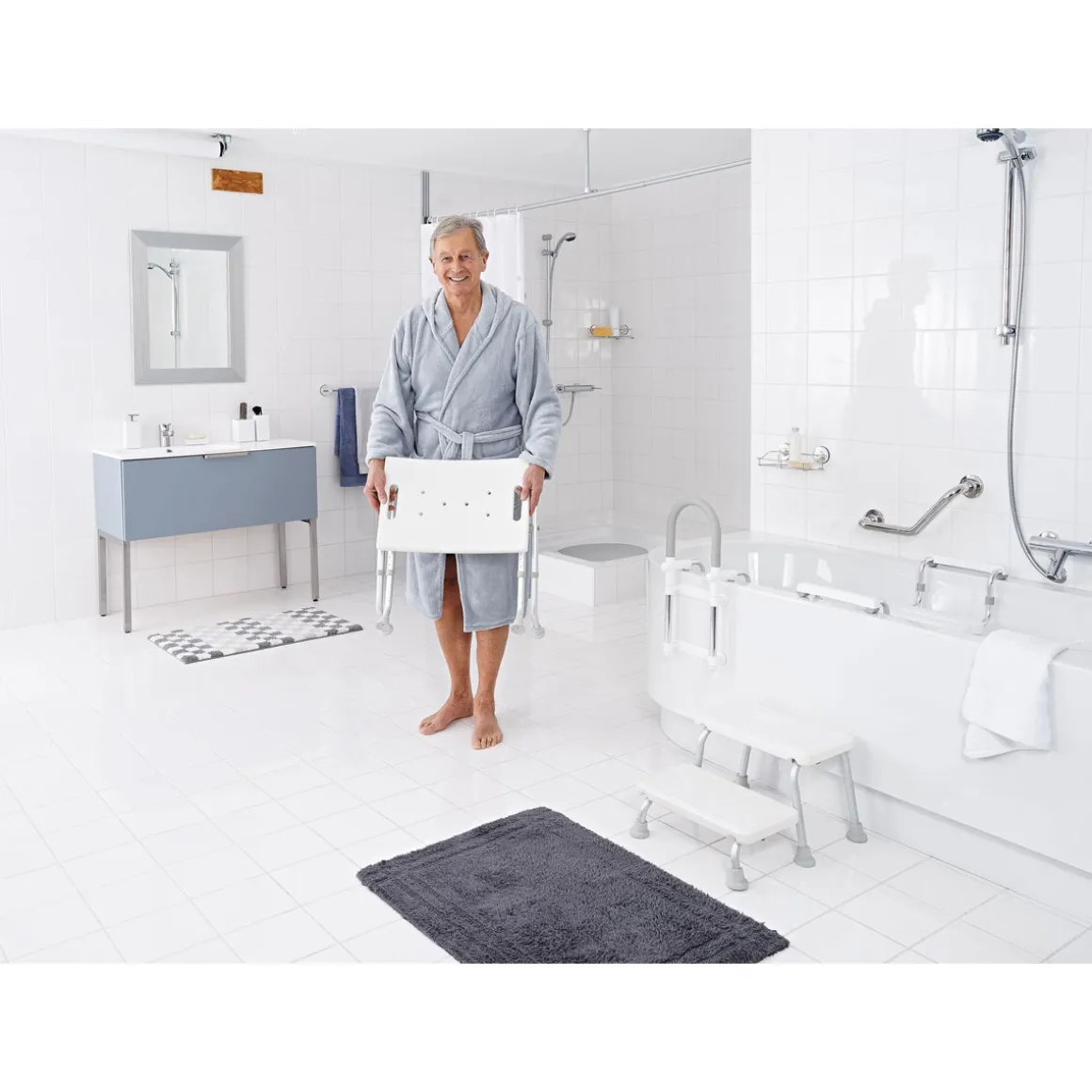 - – Rutschhemmende Sitzfläche und Fußstopfen für mehr Sicherheit im Nassbereich