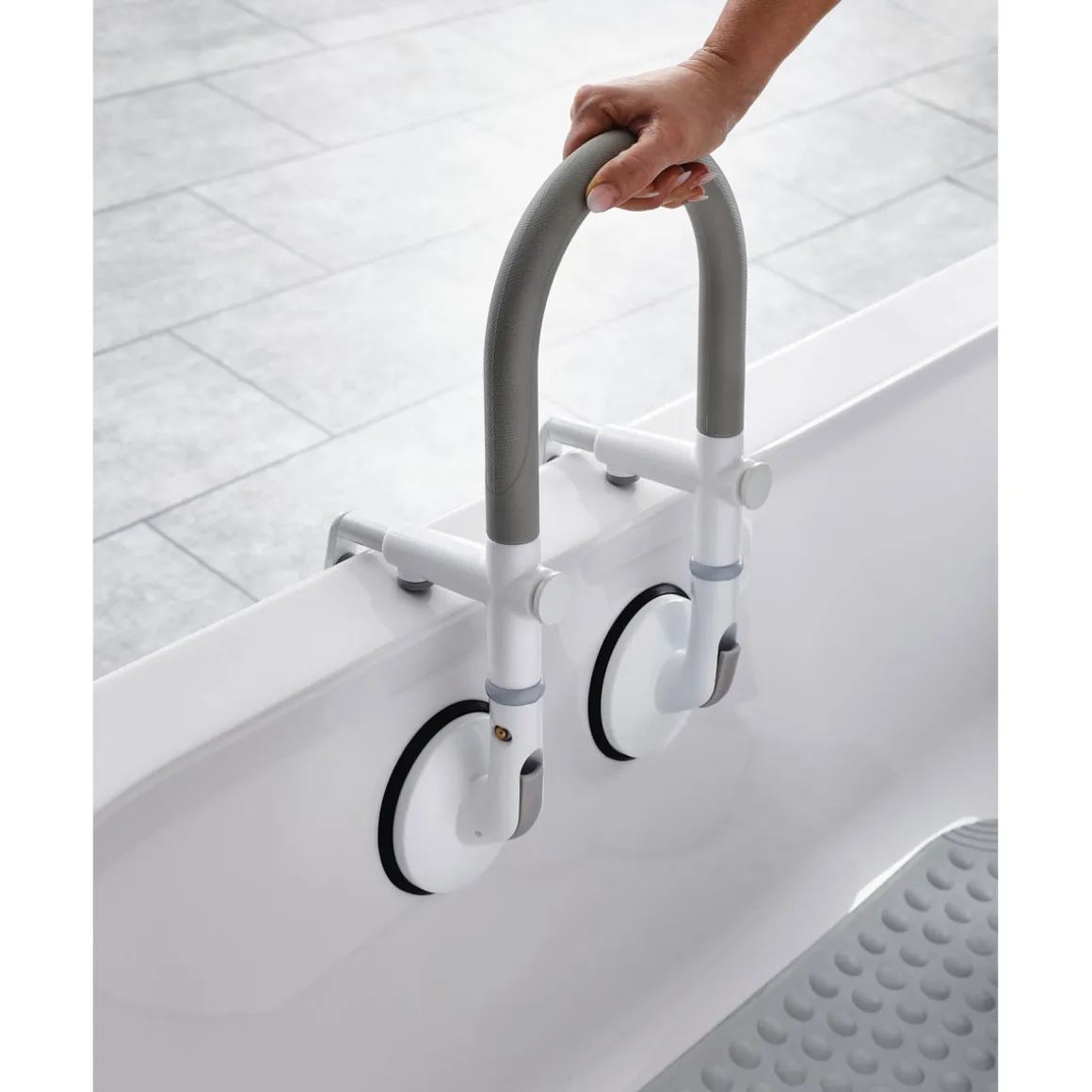 - – Ergonomisch geformte und rutschhemmende Grifffläche für bequemes Halten während des Ein- und Ausstiegs aus der Wanne