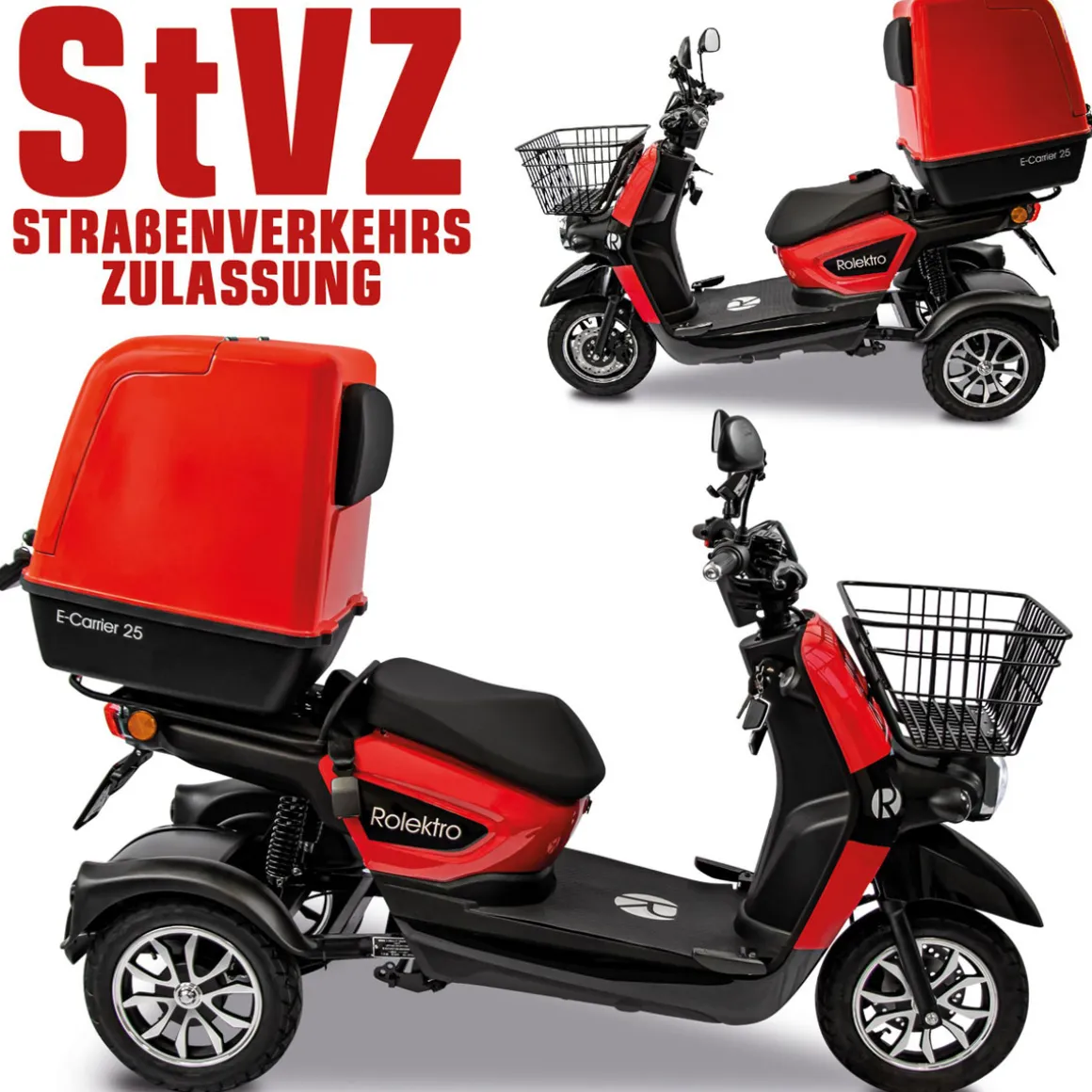 | Lieferumfang: | 1 x E-Carrier 25 V.3; 1 x EEC EU-Straßenzulassung ; 1 x Ladegerät ; 1 x Thermo-Koffer hinten; 2 x Spiegel; 1 x Frontkorb vorne ; 1 x Mobiltelefon-Halterung ; 1 x Deutsche Bedienungsanleitung; 1 x Schlüsselsatz |