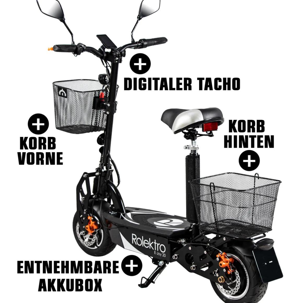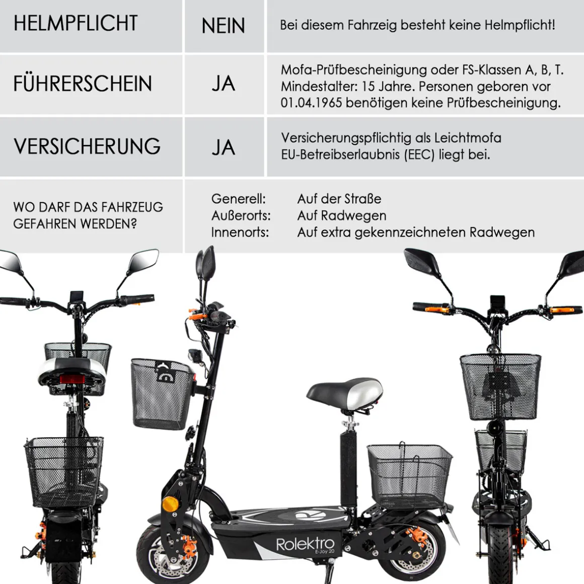 | Lieferumfang: | 1 x E-Joy 20 ,1 x EEC EU-Straßenzulassung, 1 x Ladegerät, 1 x Korb hinten, 1 x Korb vorne, 2 x Spiegel, 1 x Werkzeug-Kit |