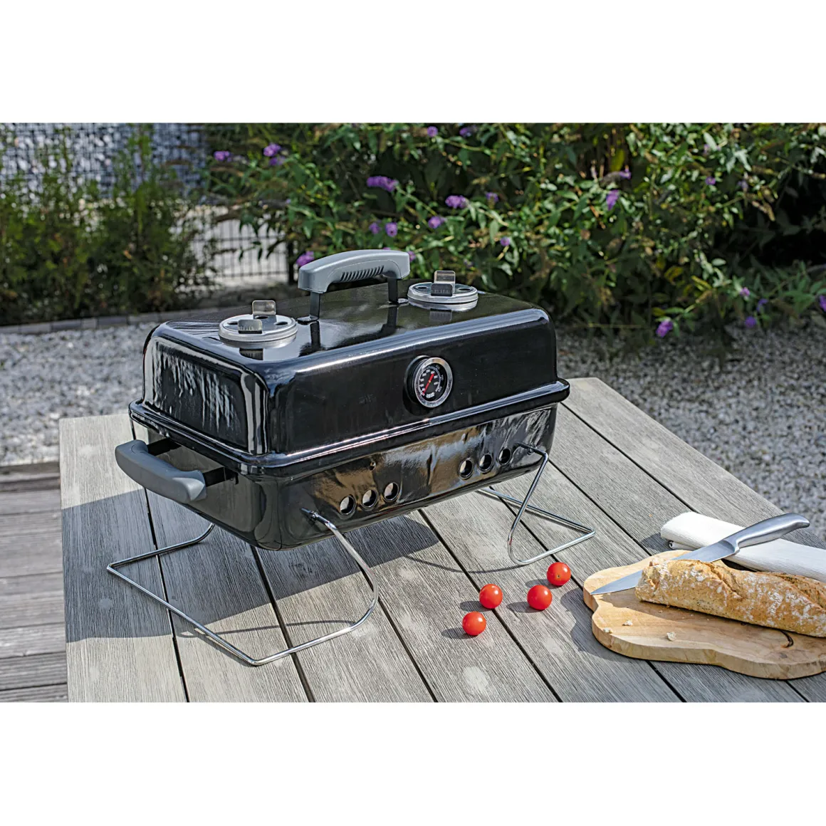 - Ausstattung: Deckelthermometer, faltbares Gestell, verchromter Grillrost
