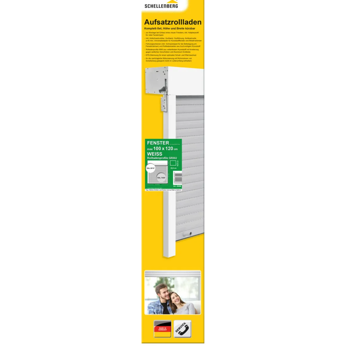 Schellenberg Aufsatzrolladen-Set für Fenster, 100 x 120 cm, weiß/grau Aufsatzrolladen-Komplettset mit umfangreichem Zubehör für die Selbstmontage • Rolladenpanzer aus leichten PVC-Profilen, Aufsatzkasten aus PVC • ideal für Gebäudesanierungen oder Neubau • inkl. Universaladapter und Metallverbinder zur Montage auf Kunststofffenstern • raumseitige Revisionsklappenöffnung • integrierte EPS-Dämmung für optimalen Wärme- und Schallschutz Ein Rolladen schützt Ihr Zuhause vor starker Sonneneinstrahlung, erhöht die Dämmung bei Kälte, Hitze oder Lärm und dient als zusätzliche Barriere gegen Insekten oder Einbrecher. Ein Aufsatzrolladen bildet mit einem Kunststofffenster eine Einheit und eignet sich insbesondere dann, wenn bei einer Gebäudesanierung oder beim Neubau neue Fenster eingesetzt werden. Bei der Montage wird der Aufsatzrolladenkasten mithilfe des Universaladapters und des Metallverbinders mit dem Fensterprofil verbunden und in die Maueröffnung eingesetzt. Der Hauptbestandteil des Aufsatzrolladens ist der Rolladenpanzer. Dieser ist gegen seitliches Verschieben arretiert und besteht aus durchgefärbten, witterungsbeständigen PVC-Profilen in Grau mit stabilem Mehrkammer-System. Die Profile entsprechen dem Rolladensystem Mini und haben eine Deckhöhe von 37 mm sowie eine Tiefe von 8 mm. Der Rolladenpanzer wird mit einer Aluminium-Endleiste mit integriertem Gummikeder abgeschlossen. Der Gummikeder sorgt für ein geräuscharmes Aufsetzen des Rolladens und verhindert das Festfrieren sowie Beschädigungen an der Fensterbank. An der Endleiste werden zudem die zwei Anschlagstopfen festgeschraubt, die dafür sorgen, dass der Behang nicht vollständig in den Kasten eingezogen wird. Der Rolladenpanzer wird im Aufsatzkasten aus hochwertigem Kunststoff mit integrierter EPS-Dämmung aufgewickelt. Dieser lässt sich nach dem Einbau raumseitig mithilfe einer Revisionsklappe öffnen. Der Rolladenkasten hat die Maße von maximal 80,0 x 16,5 x 22,0 cm (B x H x T). Darin befindet sich die Stahlrohrwelle mit Achtkantprofil und einem Durchmesser von 40 mm. An ihr werden die Rolladenaufhängungen, die Gurtscheibe und die Walzenhülse befestigt, die zur Bedienung des Rolladens notwendig sind. Der Rolladenbehang wird in zwei Aluminium-Führungsschienen mit Gummikeder geführt, welche die Lauf- und Windgeräusche des Rolladens reduzieren. Zum weiteren Zubehör des Aufsatzrolladen-Sets gehören ein Aufschraubgurtwickler mit grauem Rolladengurt, eine Schneidhilfe zum Kürzen der Bauteile, Anschlagstopfen sowie weiteres Montagezubehör. Statt der Rolladenbedienung per Hand ist es möglich, zu einem späteren Zeitpunkt einen Rolladenmotor oder elektrischen Gurtwickler von Schellenberg nachzurüsten. Dieses Aufsatzrolladen-Set mit den maximalen Maßen von 100 x 120 cm ist ideal für Kunststofffenster mit einer Höhe von max. 103,5 cm und einer Breite von max. 100 cm. Bei Bedarf kann der Aufsatzrolladen in Höhe und Breite individuell gekürzt werden. Technische Daten • Rolladensystem: Mini • Maße montiert (B x H x T): max. 100 x 120 x 22 cm • Fenstermaße (B x H): max. 100 x 103,5 cm • Kastengröße (B x H x T): max. 80 x 16,5 x 22 cm • Gewicht: 9,246 kg • Profildeckhöhe: 37 mm • Profiltiefe: 8 mm • Material Panzer: PVC • Farbe Panzer: Grau • Material Endleiste: Aluminium • Material Führungsschienen: Aluminium • Farbe Führungsschienen: Weiß • Material Aufsatzkasten: Kunststoff • Farbe Aufsatzkasten: Weiß • Farbe Gurtwickler: Weiß • Farbe Rolladengurt: Grau • Rolladengurtbreite: 14 mm • Durchmesser Rolladenwelle: 40 mm • Montage: auf dem Fenster