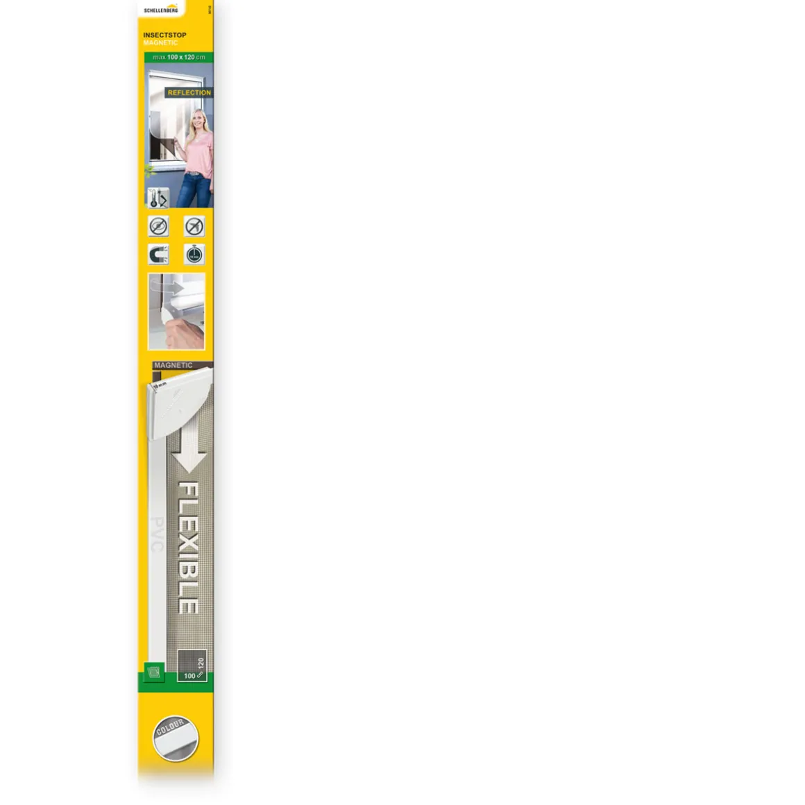Schellenberg Fliegengitter-Magnetrahmen mit REFLECTION-Gewebe, weiß, 100 x 120 cmVon außen montierender Insekten-, Sicht- und Sonnenschutz für Fenster• Kombiniert Insekten-, Sicht- und Sonnenschutz• raumseitig anthrazitfarbenes Gewebe, gute Durchsicht nach draußen• Montage nur von außen am Blendrahmen des Fensters möglich• geringe Einbautiefe, passt hinter einen Rolladen• Befestigungsmaterial im Lieferumfang enthaltenDas Fliegengitter REFLECTION mit Magnetrahmen ist ideal, um Insekten-, Sicht- und Sonnenschutz zu kombinieren. Das Gewebe ist auf der Außenseite aluminiumbeschichtet und sorgt so nicht nur für einen zuverlässigen Schutz vor Insekten, sondern auch für einen verbesserten Sichtschutz. Die glänzende, UV-stabile Oberfläche reflektiert zudem das einfallende Sonnenlicht, sodass sich der Wohnraum weniger erhitzt. Raumseitig ist das Gewebe anthrazitfarben und ermöglicht so eine gute Durchsicht nach draußen. Das Insektenschutz-Komplettset besteht aus einem reflektierenden Fliegengitter, einem beweglichen Magnetrahmen und benötigtem Montagezubehör. Das Insektenschutzgewebe wird in den magnetischen Spannrahmen eingekedert und anschließend mithilfe eines selbstklebenden Magnetstreifens von außen am Blendrahmen des Fensters befestigt. Die magnetische Befestigung ist nur möglich, wenn Sie von außen Zugang zum Fenster haben. Der Fliegengitter-Magnetrahmen kann jederzeit abgenommen oder angeheftet werden. Die Maße können bei Bedarf individuell angepasst werden. Sollte das Gewebe verschmutzt sein, ist es bis 30 °C waschbar.Das Komplettset passt mit einer geringen Einbautiefe von 10 mm hinter die meisten Rolläden. Unterstützende Halterungen für besonders festen Halt, z. B. bei starkem Wind, sind im Lieferumfang enthalten.Technische Daten• Maße: 100 x 120 cm• Rahmenfarbe: Weiß• Profilmaterial: PVC• Gewebematerial: aluminiumbeschichtetes Polyestergewebe• Gewebefarbe: Anthrazit/Aluminium• Befestigung: Klebe-/Magnetbefestigung (nur von außen möglich)• Profiltiefe: 10 mm• Reinigung des Rahmens: abwaschbar• Reinigung des Gewebes: waschbar bis 30 °C