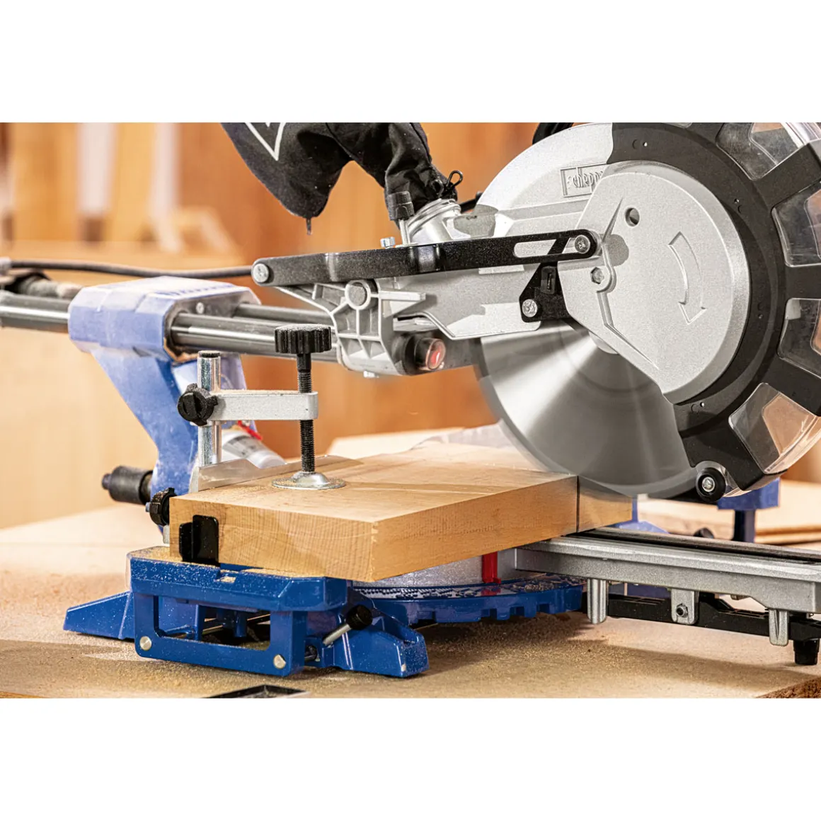 - Doppelsäulenführung ermöglicht besonders stabile Schrägschnitte ohne Verrutschen des Werkstücks