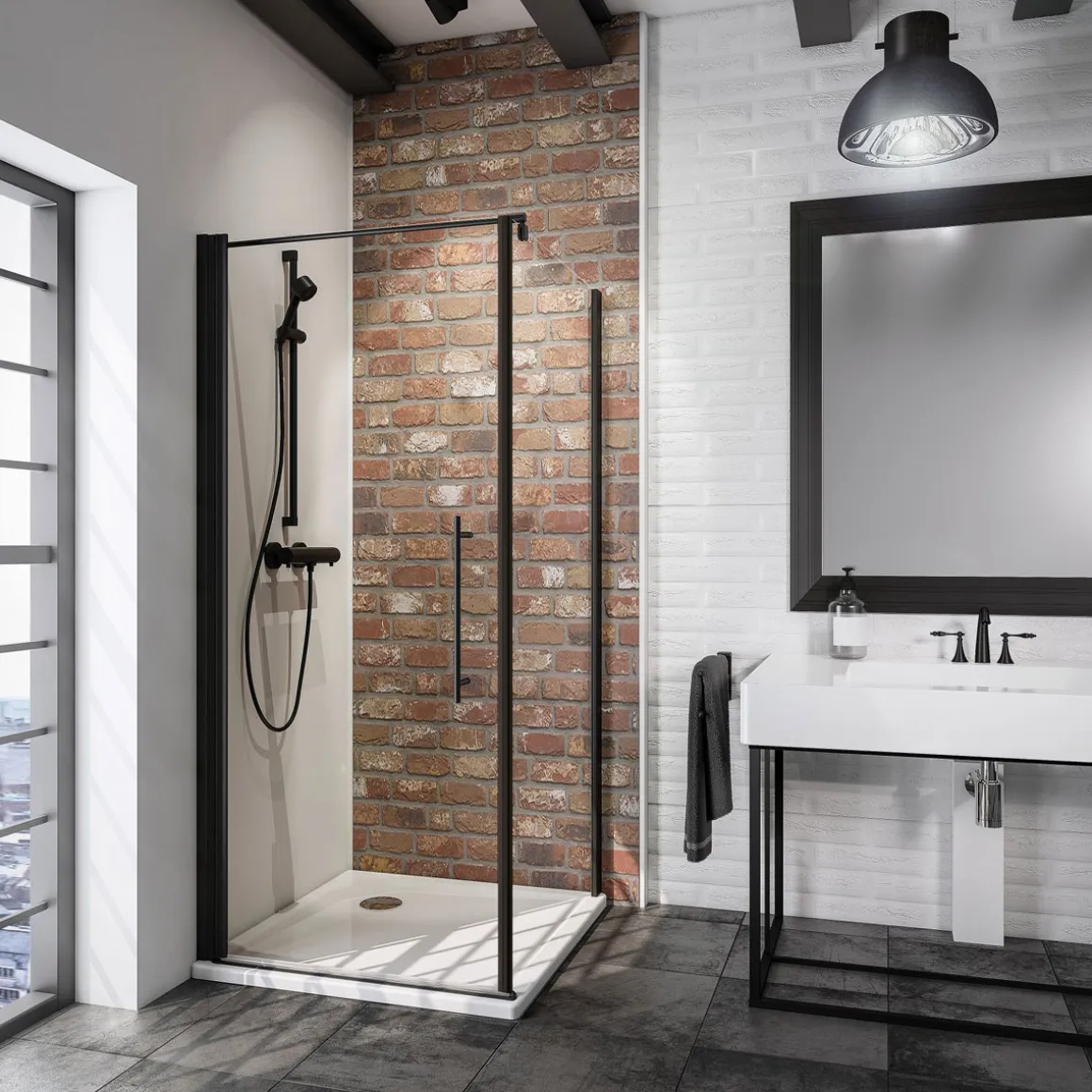 Hochwertige und formschöne Aluminiumprofile sowie ein, dem gleichen Look entsprechender, Stabgriff in elegantem, mattem Schwarz werden Ihr Bad signifikant aufwerten. Die schwarze Duschkabine für den bequemen Eckeinstieg begeistert jedoch nicht bloß mit ihrem extravaganten Design: Der Artikel punktet auch als zuverlässiger Spritzschutz und zeichnet sich zudem durch seine unkomplizierte Reinigung aus.