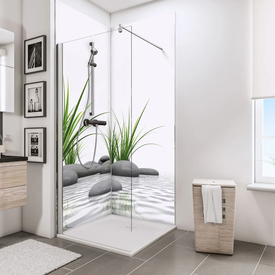 Schulte ExpressPlus Duschrueckwand DecoDesign Foto ue Eck Zen Steine u Gras 2100 x 900