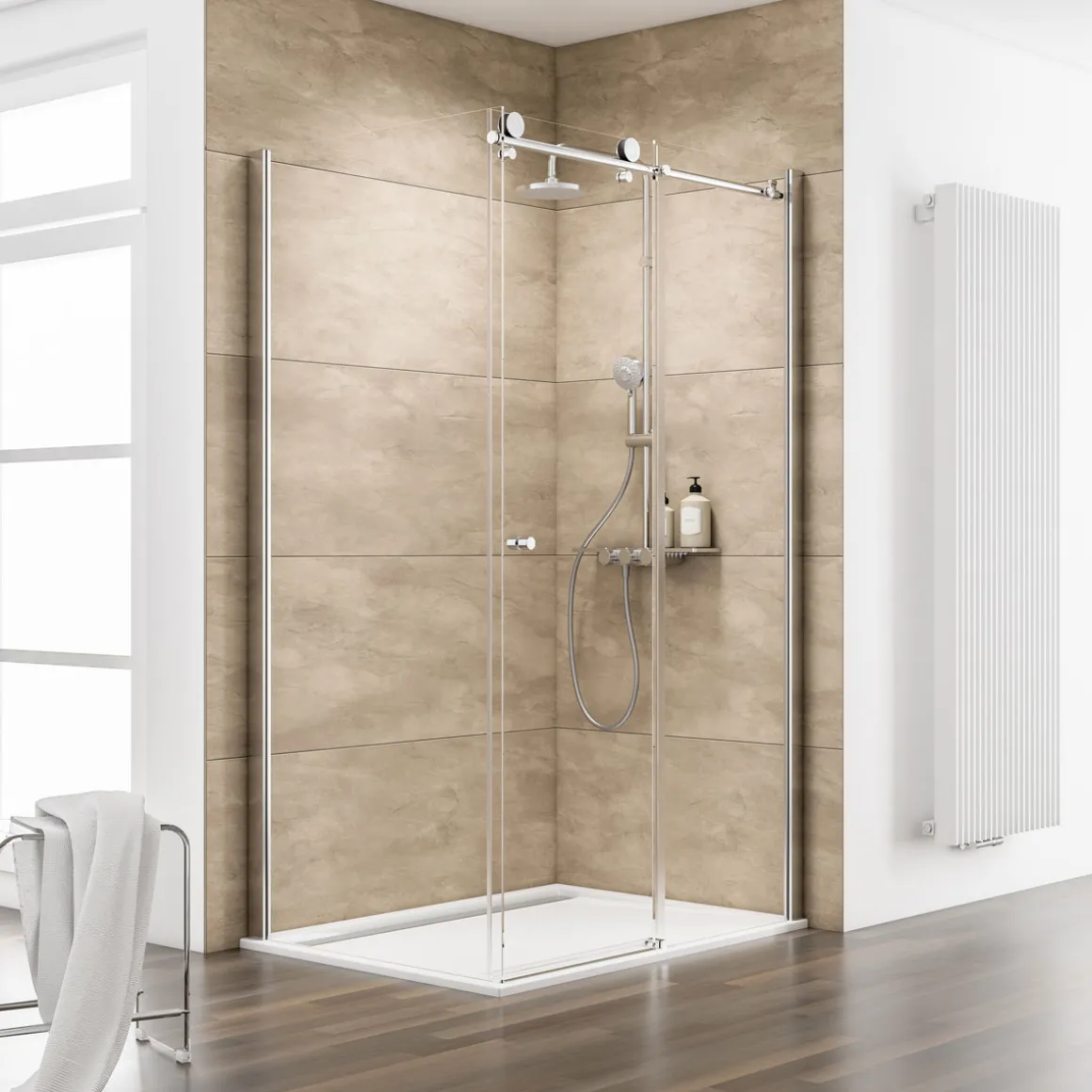 Die Schiebetür mit Seitenwand der Serie MasterClass verfolgt einen eleganten Look, der von wenig dezenter Rahmung sowie einer formschönen Laufschiene in Chromoptik bestimmt wird.Der grazile, runde Griff folgt dieser Linie ebenfalls.Dank der dezenten Gestaltung der Anbauteile werden die drei hochwertigen Glaselemente besonders in Szene gesetzt: Die brillante Transparenz des nach DIN Norm gefertigten Sicherheitsglases (ESG) verleiht jedem Raum Leichtigkeit und eine charmante Atmosphäre. Dieser Artikel wird inklusive einer Duschwanne mit Rinne und extra-flacher Einstiegshöhe geliefert.