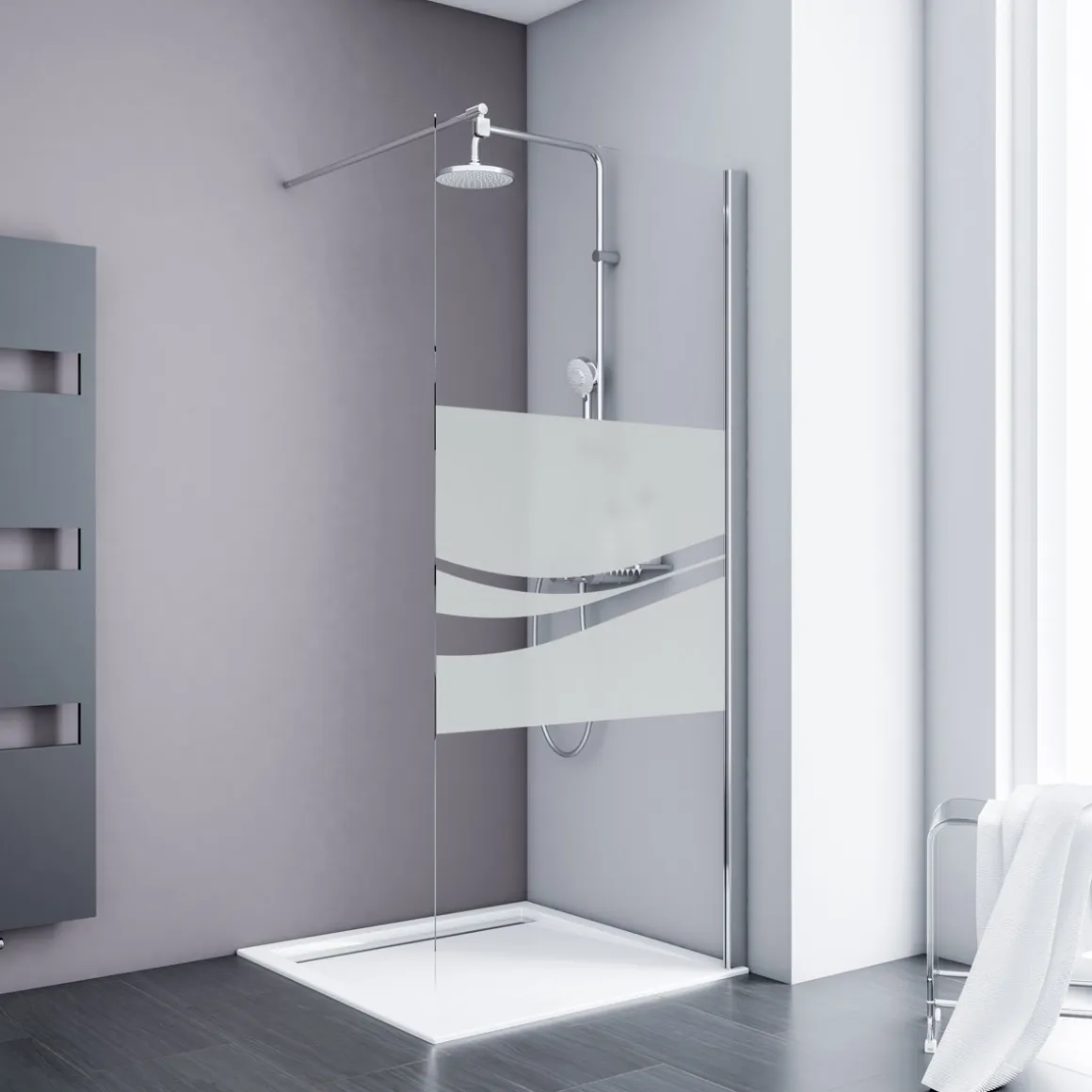 Diese Duschwand Walk In der Serie Alexa Style 2.0 von Schulte ist mit einem modernen, sandgestrahlten Dekor ausgestattet, welches Ihr Bad dekorativ bereichern wird. Die Tür aus 5 mm starkem Echtglas (ESG) wird mit einem eleganten Profil sowie einem formschönen Stabilisationsbügel in Chromoptik in der Einbausituation befestigt. Auf diese Weise wird ein hohes Maß an Stabilität gewährleistet, ohne der Duschwand ihre optische Leichtigkeit zu nehmen.